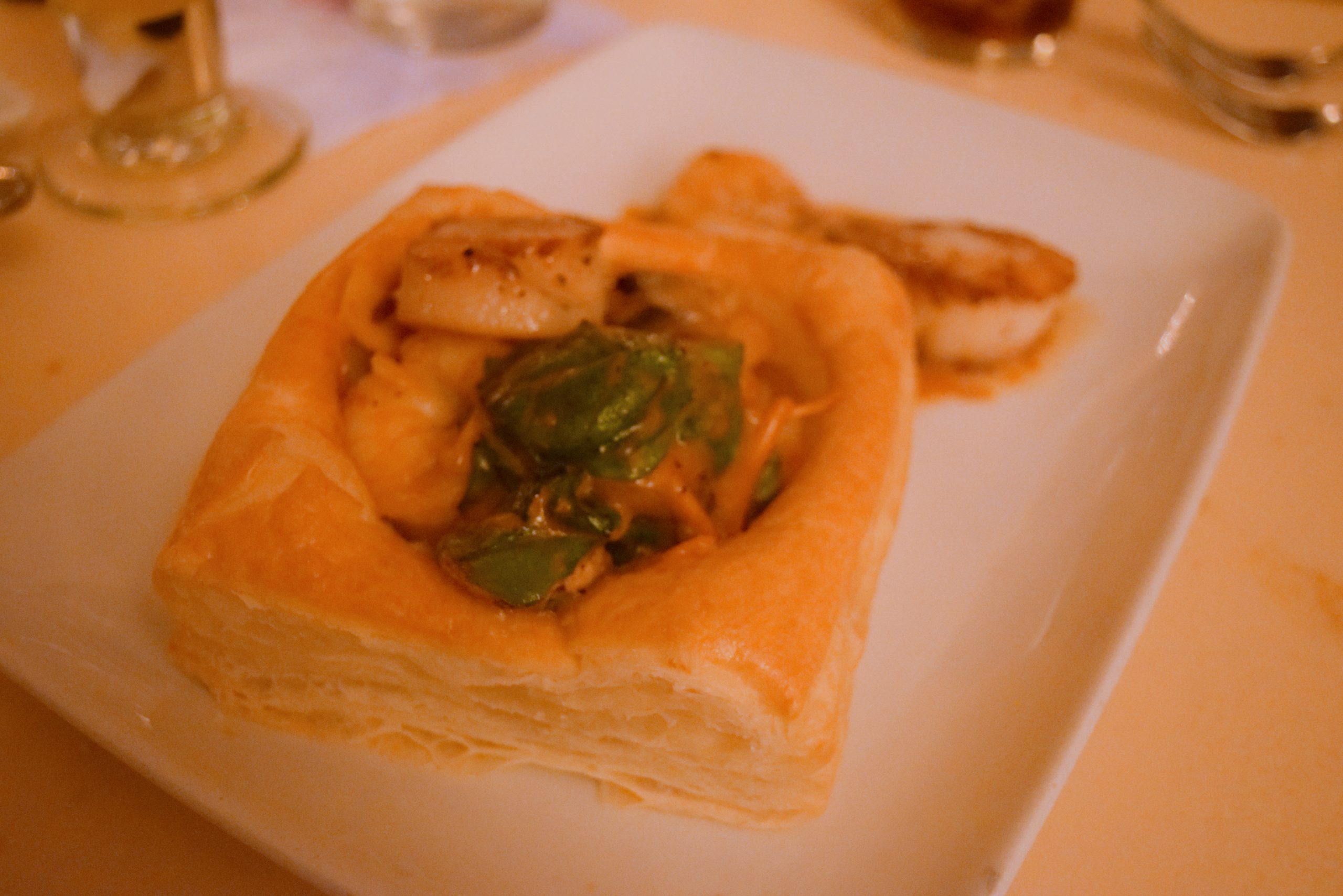 Sautéed Shrimp and Scallops - Massa folheada com uma abertura no meio repleta de molho de lagosta. Na cobertura, camarões e escalopes (vieras). De-li-ci-o-so! Valor: U$26.99