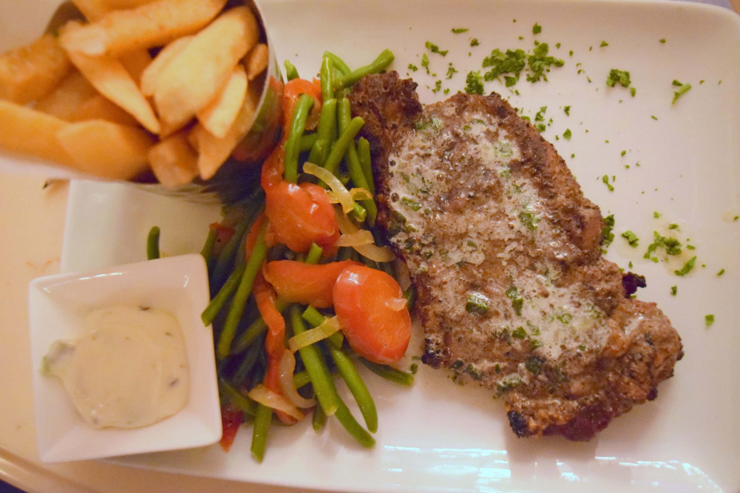 Grilled Strip Steak - Steak de carne acompanhado de batata-frita. Este é o prato mais comum do cardápio e, certamente, pedido por quem não come frutos do mar. Valor: U$33.49