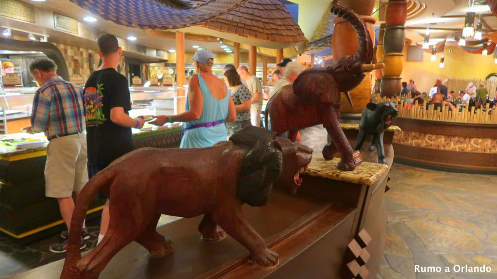 O ambiente do restaurante é todo inspirado na África. Móveis escuros, uniformes dos garçom nas cores marrom, amarelo, verde e vermelho e elefantes espalhados por todo lado.