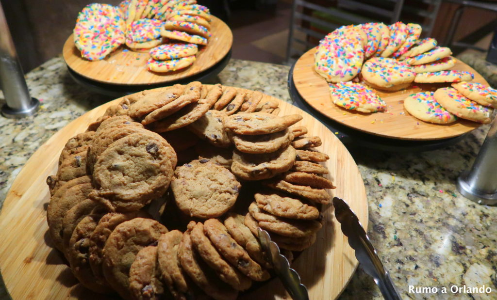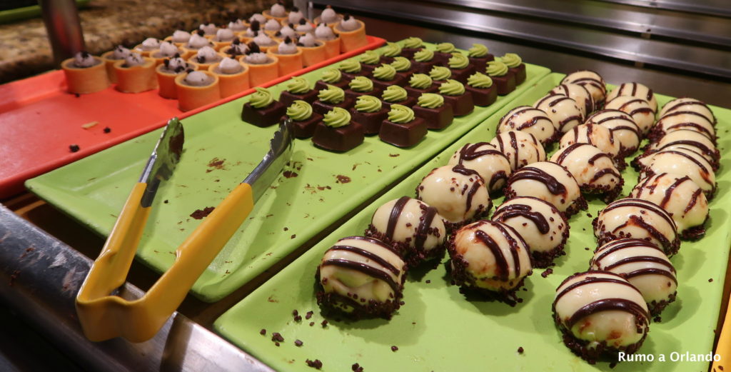 Na parte das sobremesas, há variados tipos de doces e cookies.