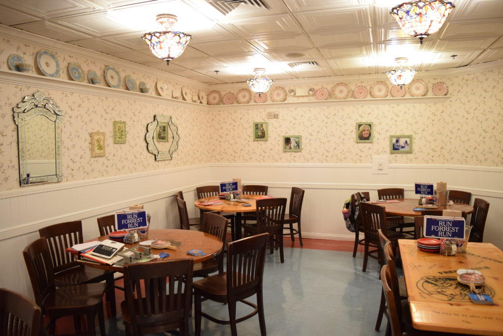 Eles possuem um sistema de chamada dos garçons bem peculiar. Em cima de cada mesa há um suporte com duas placas. A primeira, uma vermelha escrita "Stop, Forrest. Stop" e a segunda, uma azul escrita "Run, Forrest. Run".