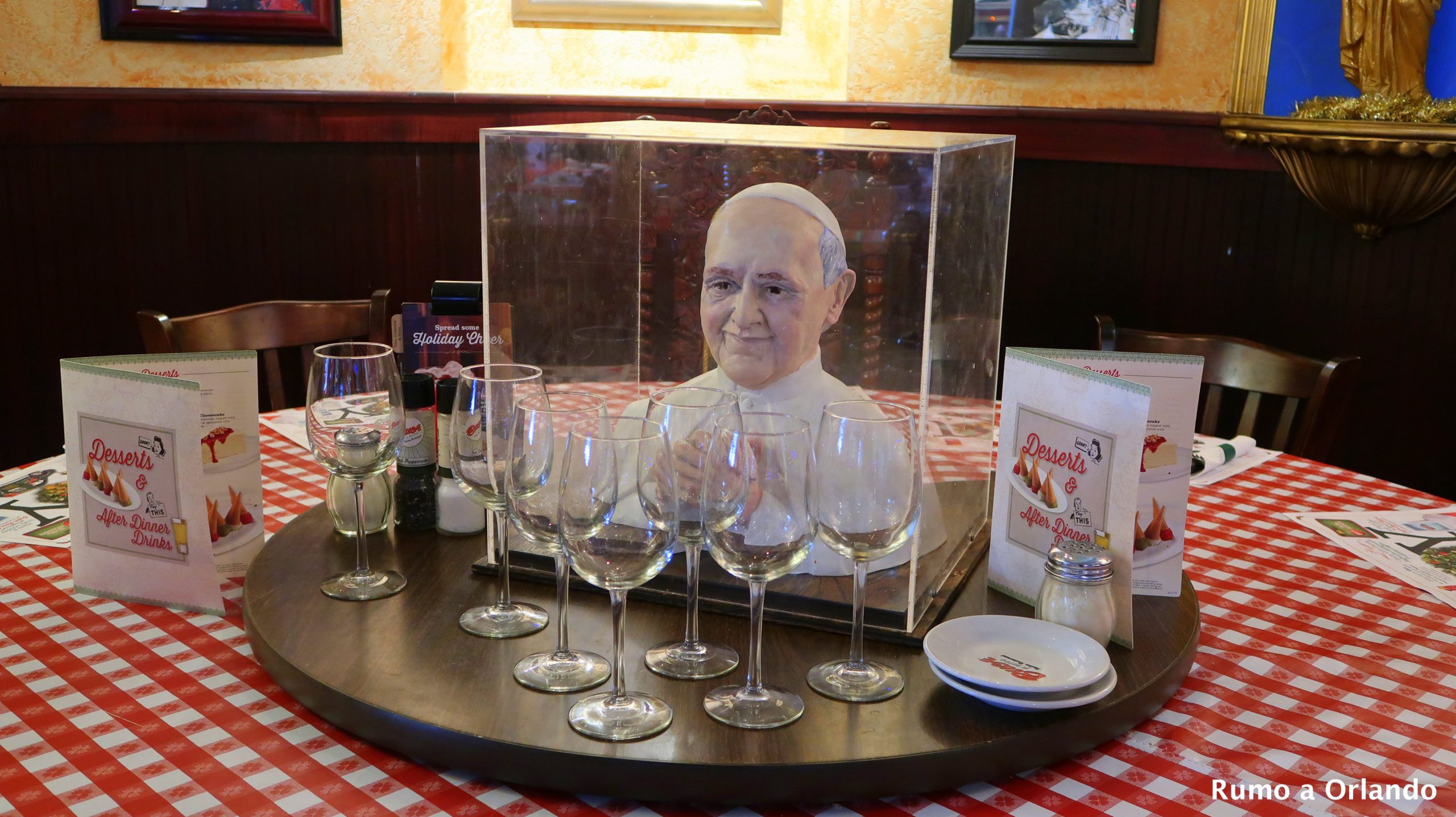Um dos destaques fica por conta da mesa que tem a imagem do Papa ao centro. Tem ela em todas as unidades e muita gente pede para sentar ali.