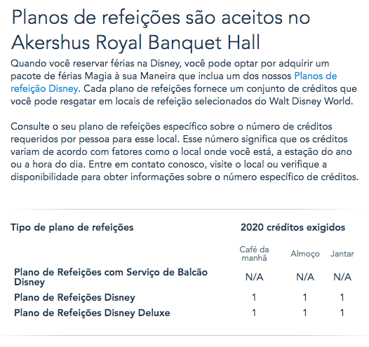 O Plano de Refeições da Disney - Disney Dining Plan é aceito e abaixo você pode conferir os créditos necessários: