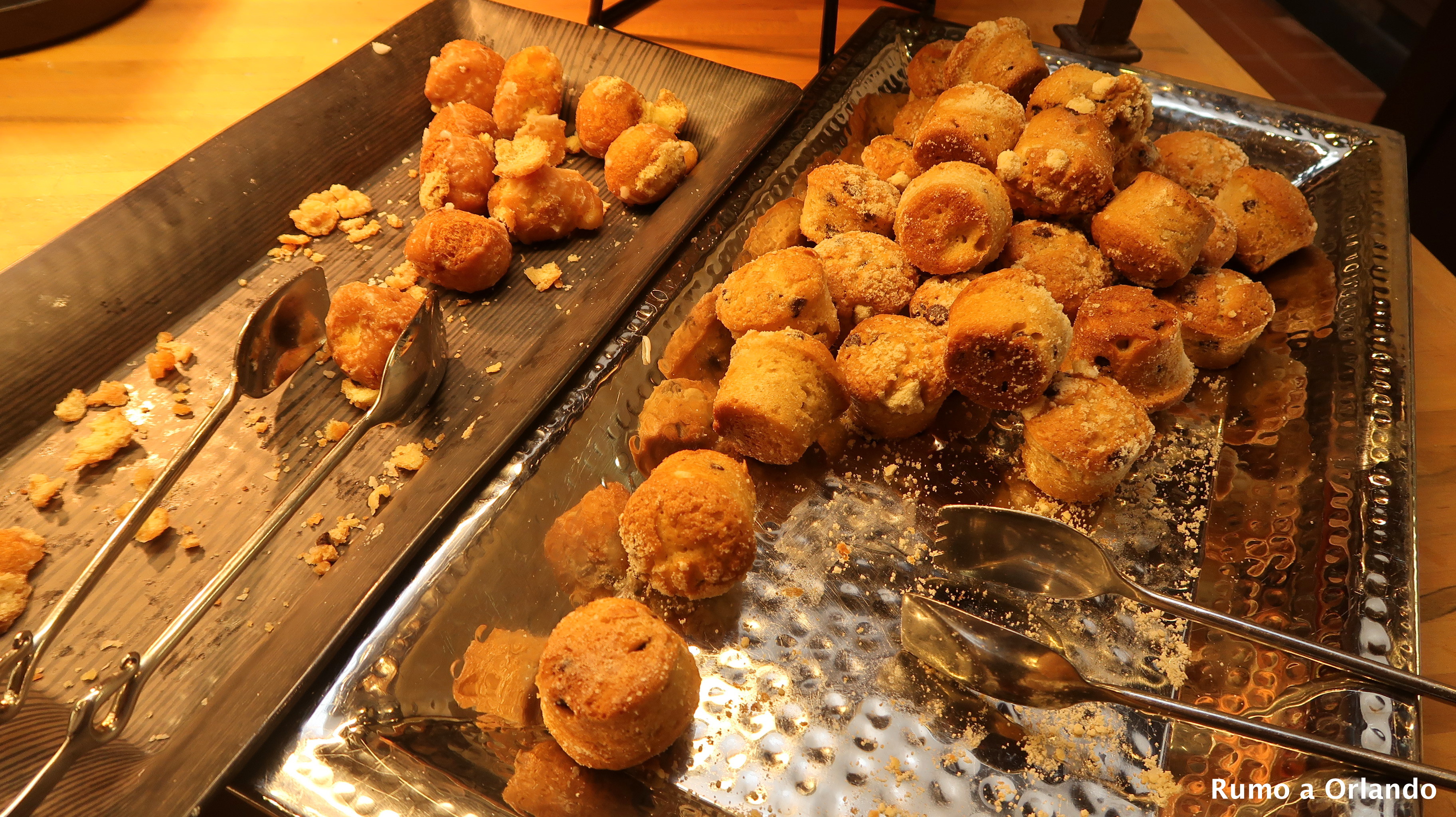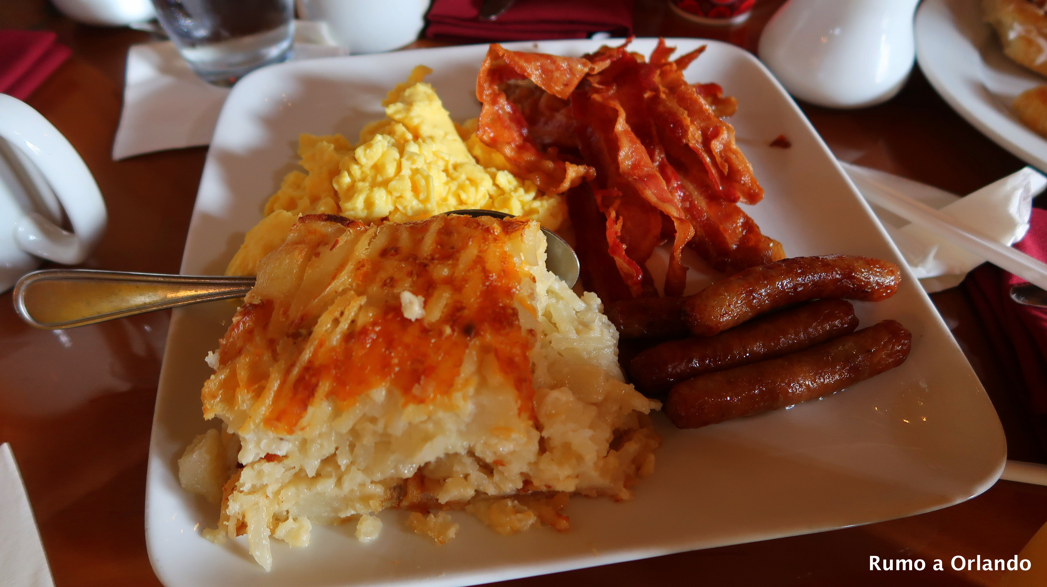 Na mesa, o garçom serve apenas as bebidas (café, chocolate quente, leite, suco, água e refrigerante), conforme o pedido de cada pessoa, e traz para todos uma bandeja com comidas quentes: ovos mexidos, bacon, linguiça e Potato Casserole, que é uma torta de batatas com queijo bastante típica do café da manhã americano (já havia falado dela no post do Cracker Barrel).