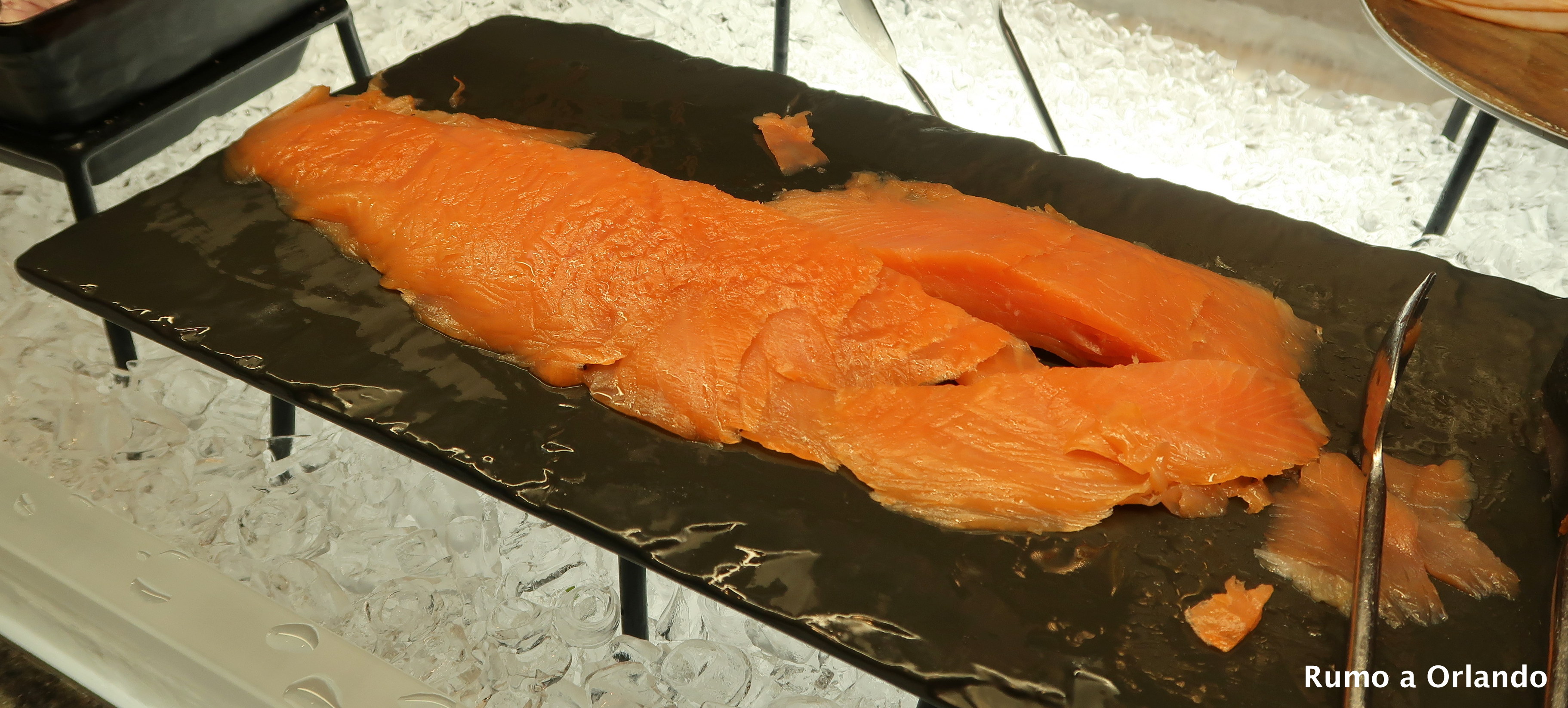 Na bancada, ficam os pratos frios: pães, doces, frutas, salmão cru, tortas, presunto, queijo e iogurte.