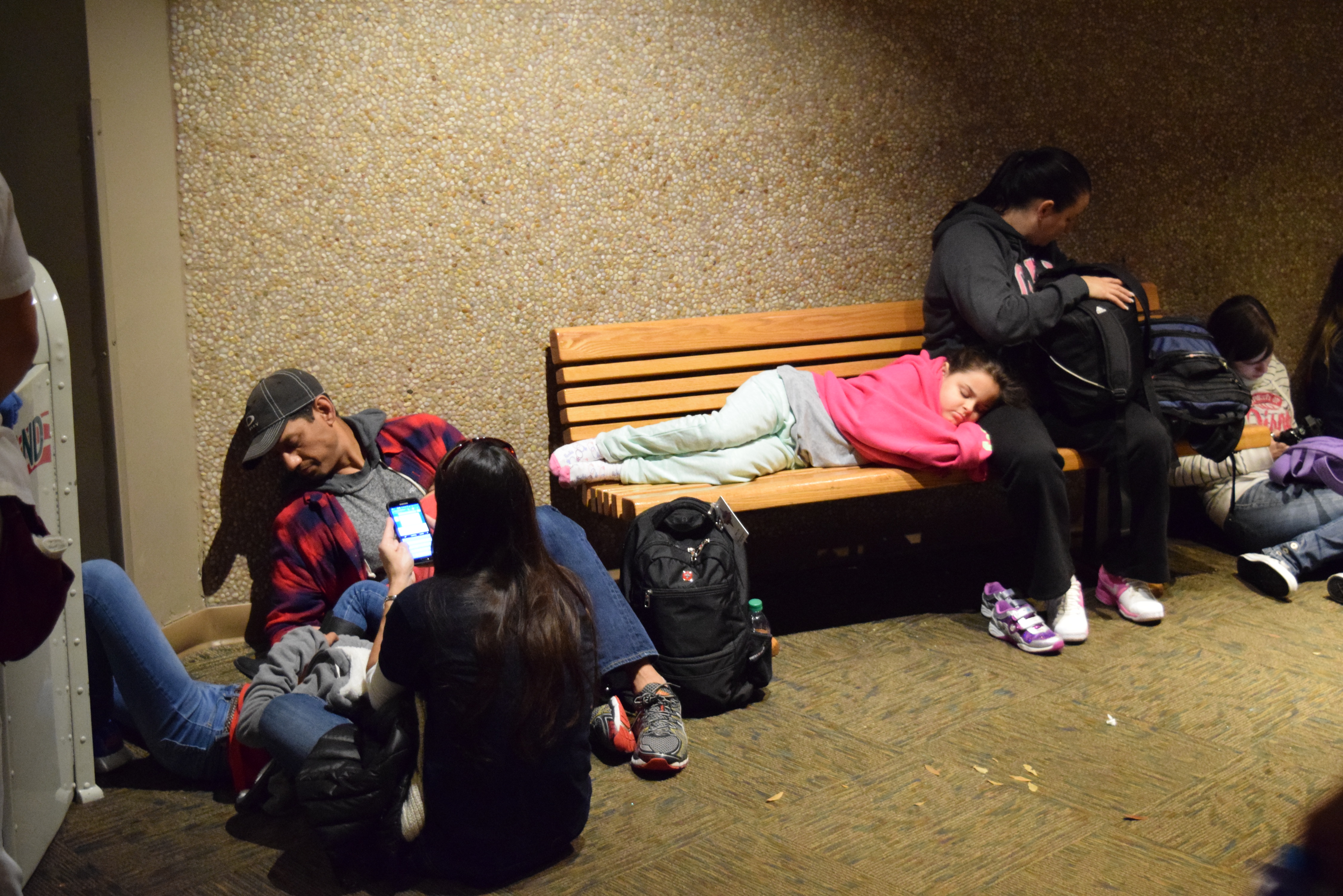 Percebemos muitas pessoas sentadas nos bancos e no chão em vários locais do parque. Parecia que estavam guardando energia para a noite ou que estavam mesmo entediadas por estarem em um parque cheio, sem poder aproveitar as atrações por causa das filas enormes. Esta cena não é comum em dias normais.