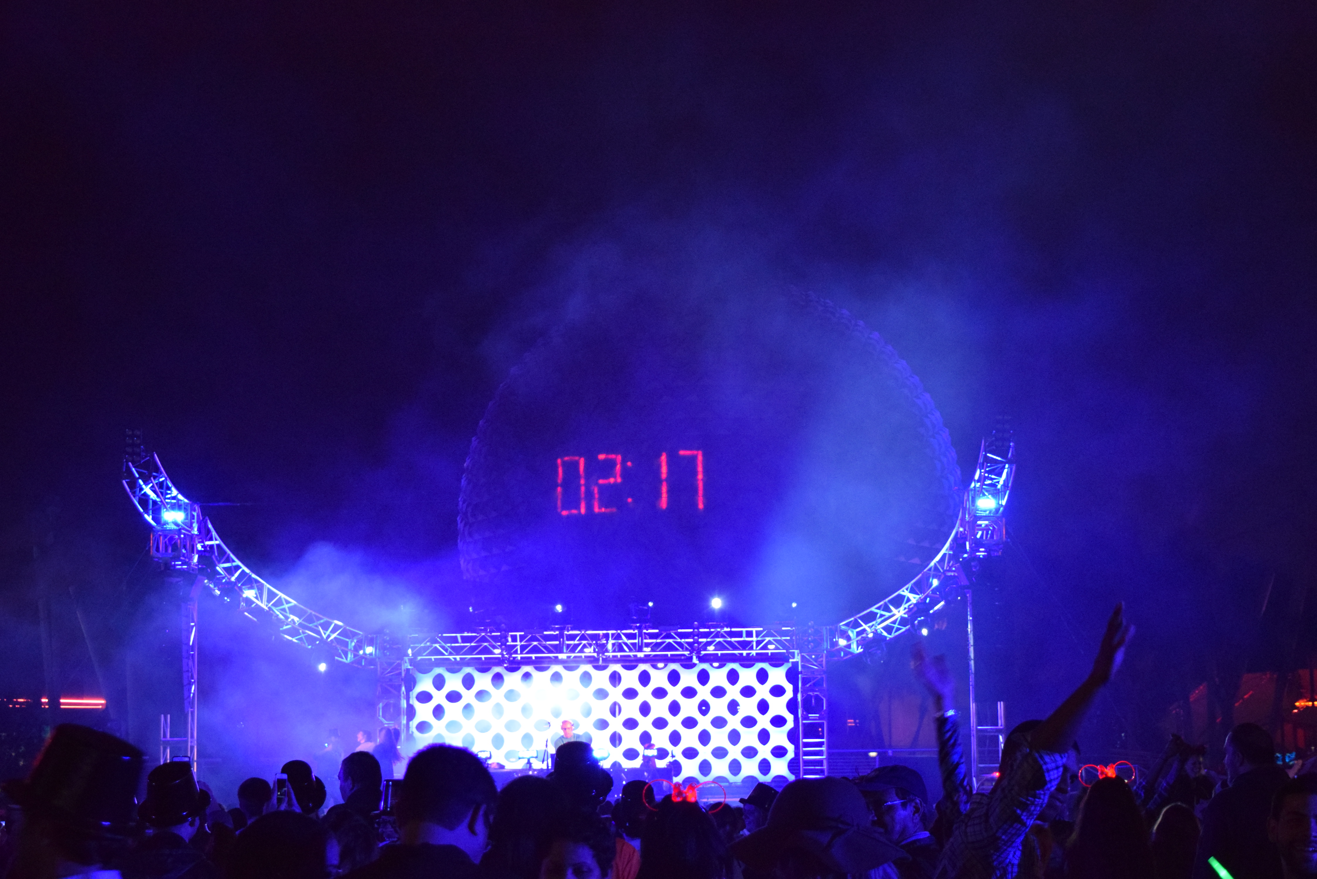 Área da fonte do Future World – o DJ desta área estava pegando mais leve, tocando músicas mais para o Pop. Nesta área, havia muitas famílias com crianças. Talvez por ter mais espaço ou por causa do tipo de música mais light mesmo. Deste local, é possível ver a Geosfera (símbolo do parque), que nesta data fica iluminada com a contagem regressiva para a virada de ano. Muito bacana.
