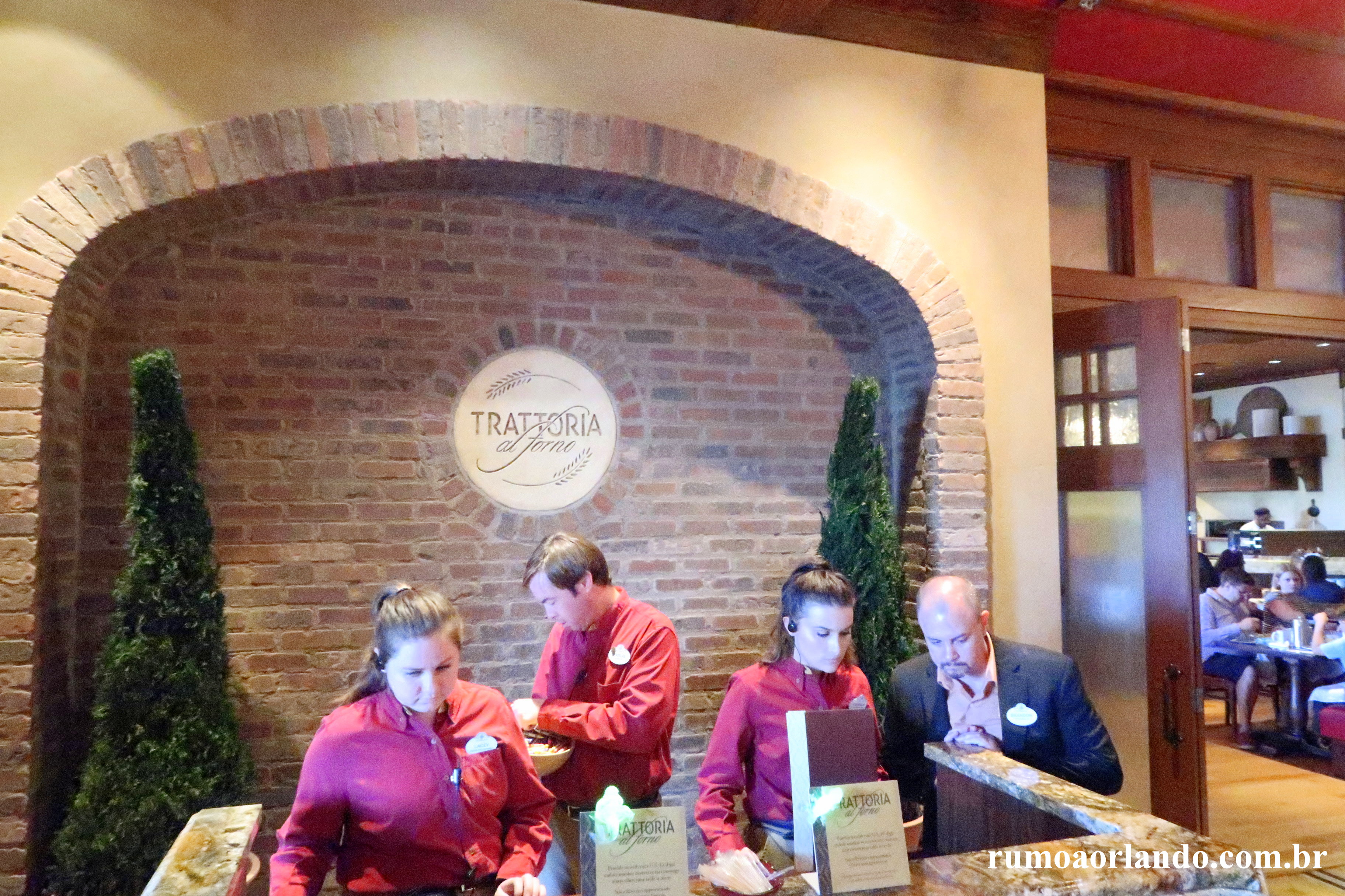 O ambiente do Trattoria Al Forno é bem elegante, com móveis escuros, cozinha exposta e decoração impecável.