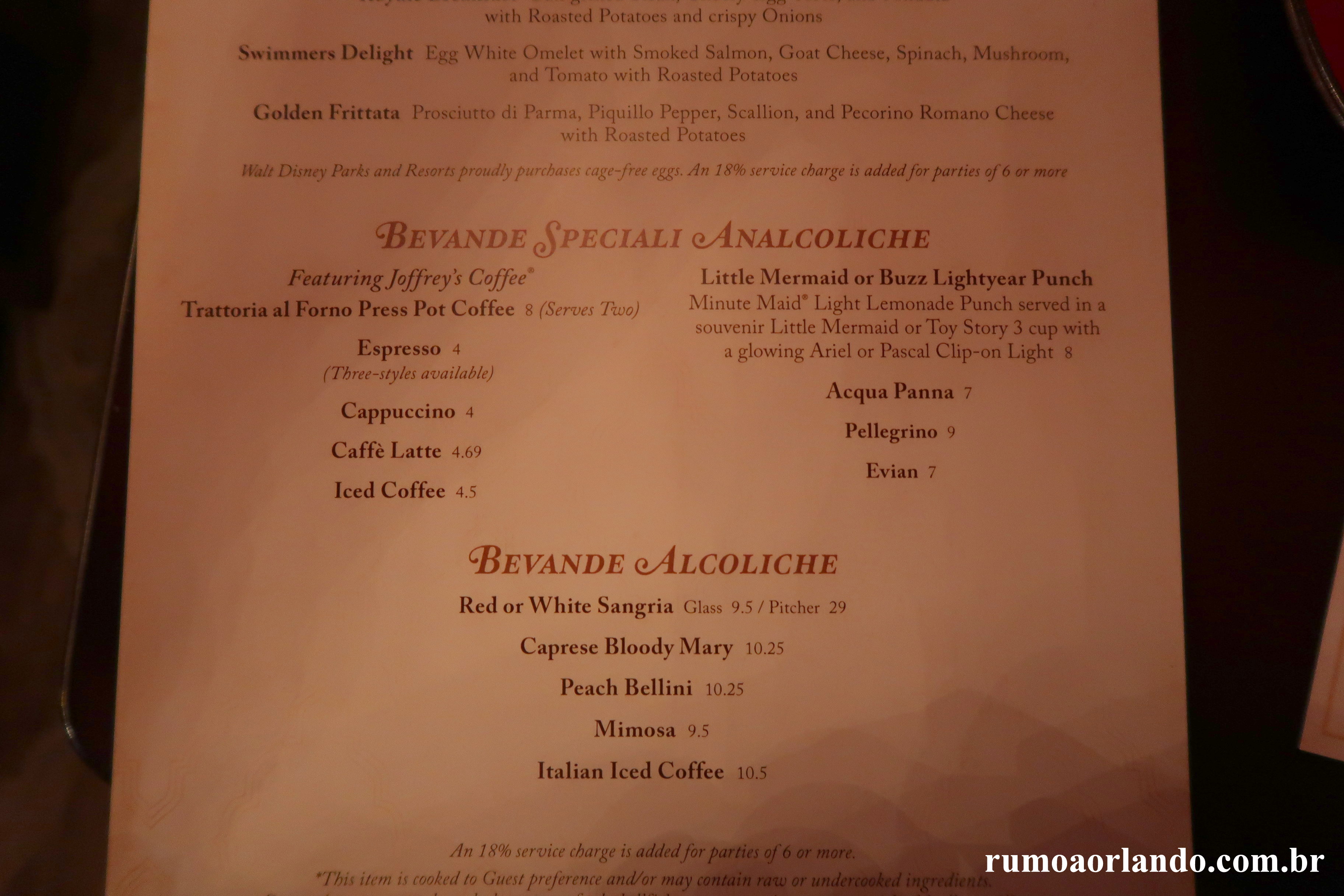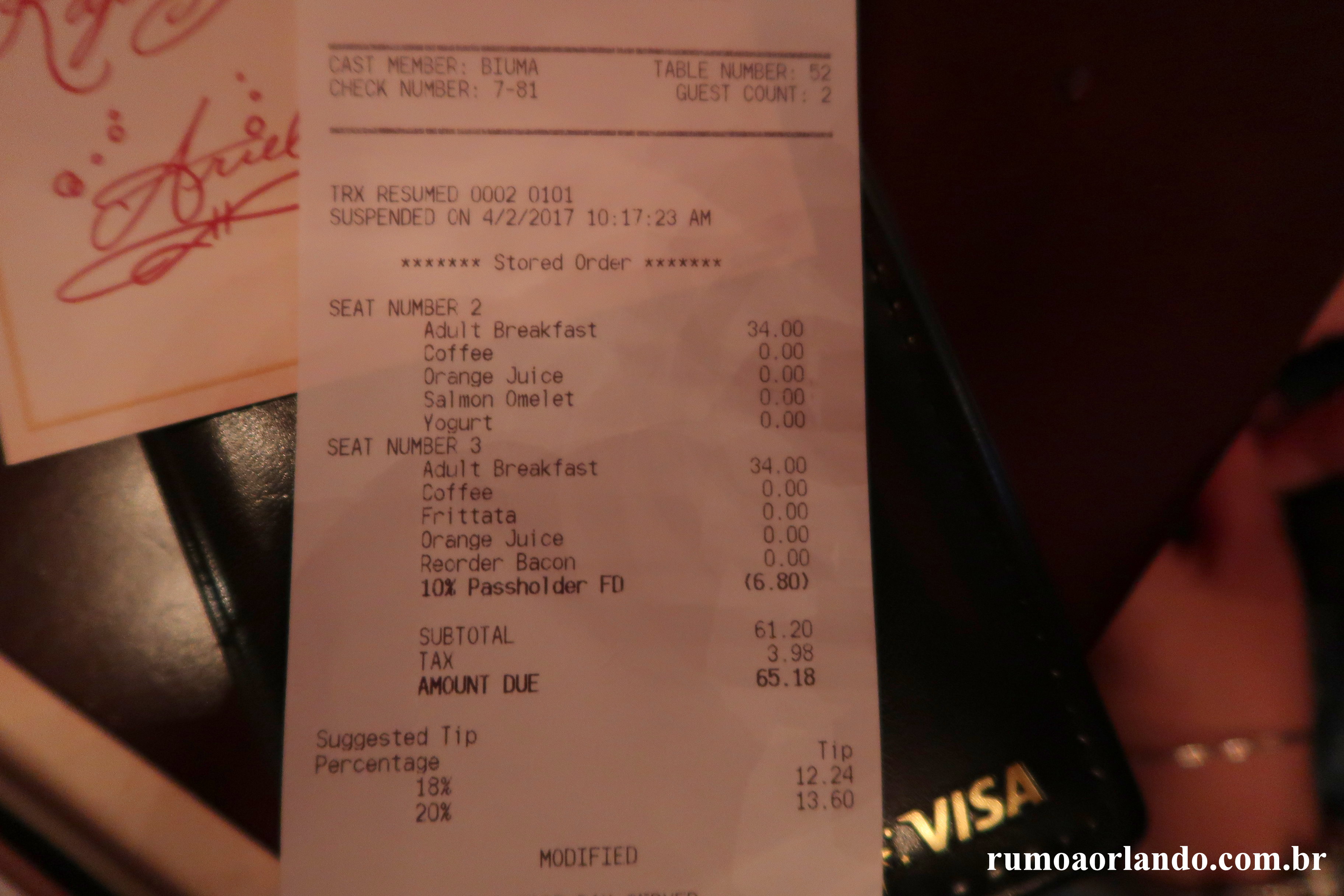 No Bon Voyage Adventure Breakfast, pagamos pelo café da manhã exatos U$ 34 por adulto. A este valor, é necessário acrescentar as taxas e a gorjeta, que pode ser de 18 ou 20%. Crianças pagam U$ 20 - valores sujeitos à alteração.