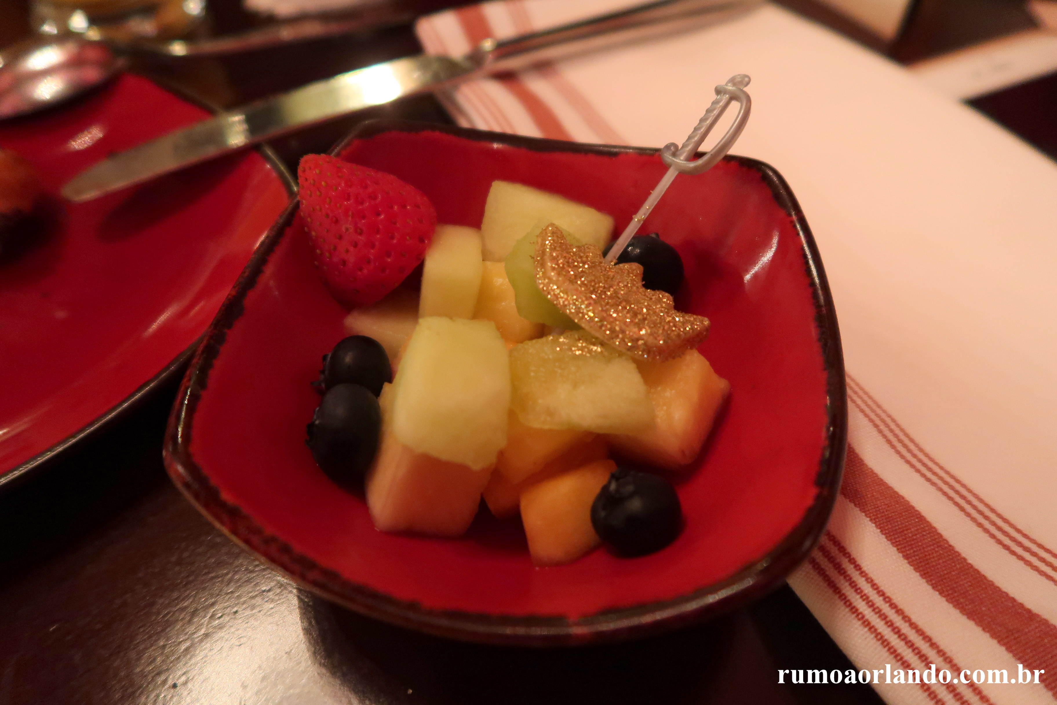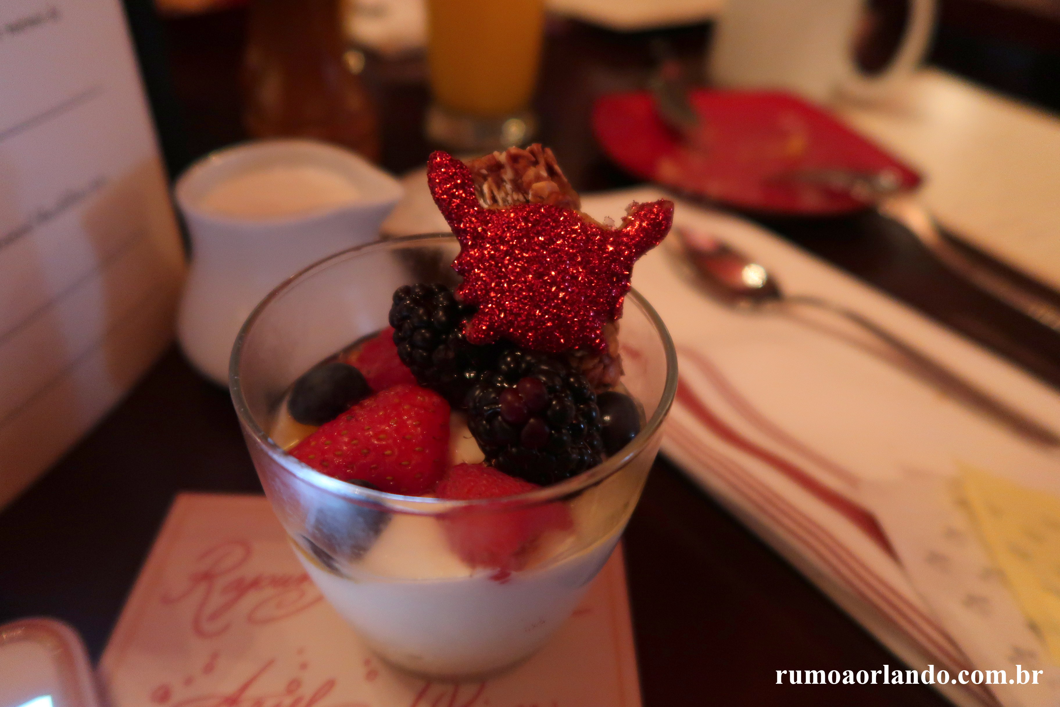 Após ela, é hora de escolher entre as duas entradas oferecidas: salada de frutas ou iogurte com berry (frutas vermelhas) e granola, que é simplesmente delicioso. De todos que já provei aqui nos EUA, seja em restaurantes ou os vendidos em mercados, este foi o mais gostoso e menos ácido.