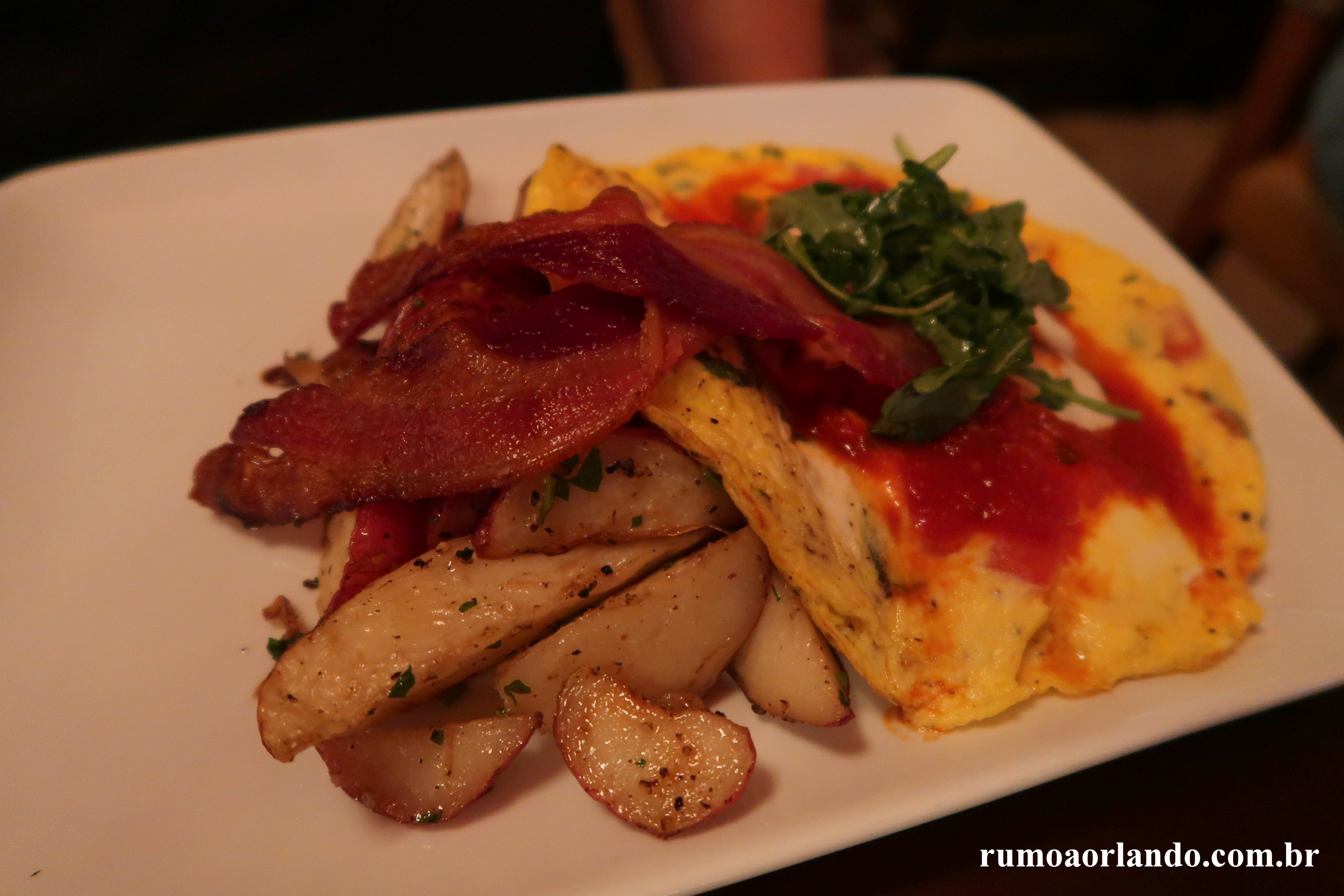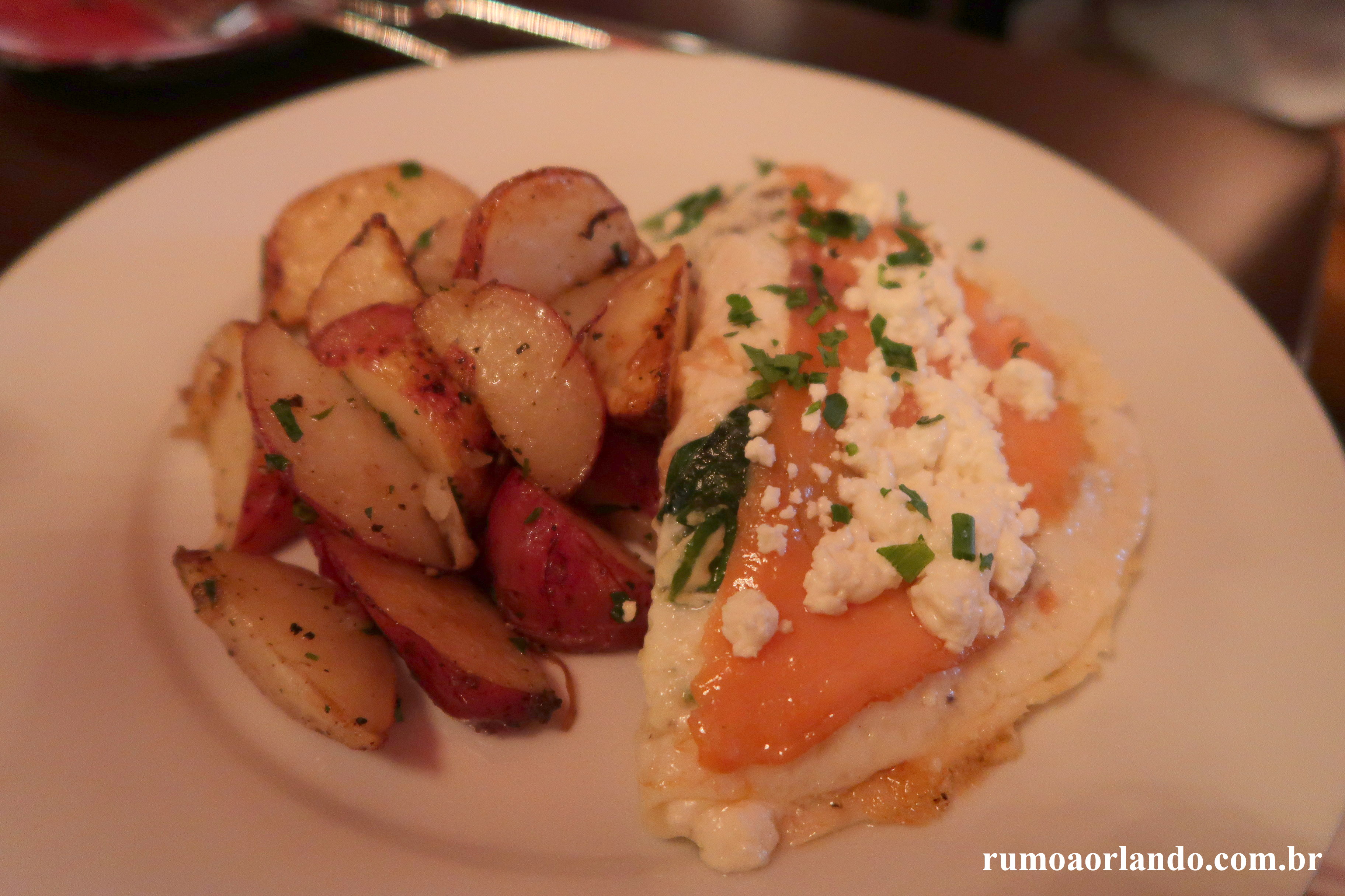 - Swimmers Delight Omelete com salmão defumado, queijo de cabra, espinafre, cogumelo e tomates com Mushroom, servido com batatas assadas.