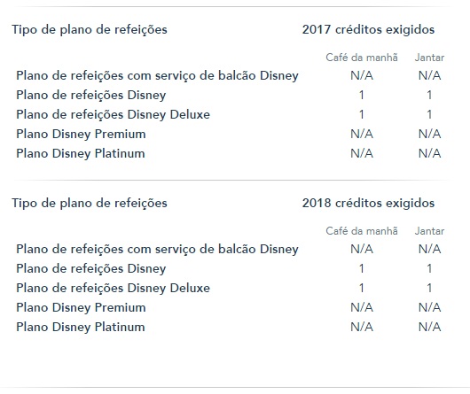 Caso você faça parte do Plano de Refeições da Disney, confira abaixo os créditos que são exigidos: