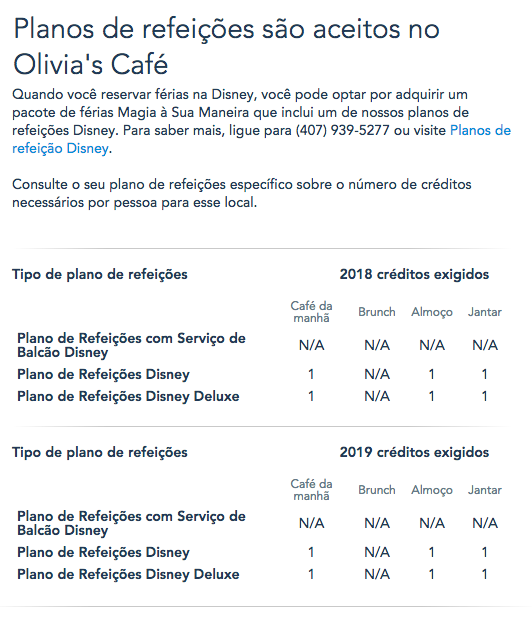 Caso você faça parte do Dinning Plan, o Plano de Refeições da Disney, confira abaixo os créditos exigidos: