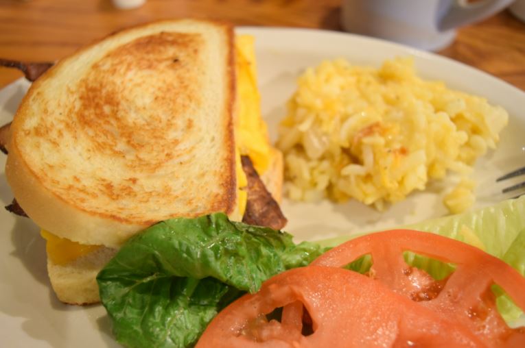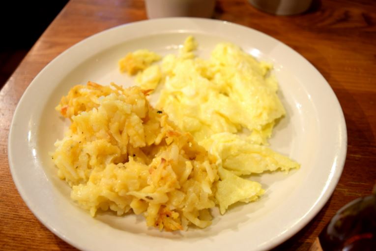 Momma's French Toast Breakfast - inclui 04 generosas torradas com manteiga feitas com clara de ovos (French Toast), dois ovos à sua escolha - nós optamos por mexidos - e o delicioso Hashbrown Casserole, que é divino e feito com manteiga, sopa de frango, cebolas e queijo. Ainda vem um xarope de açúcar para quem desejar adoçar o salgado. Valor: U$ 7.99 Valor sujeito à alteração sem aviso prévio.