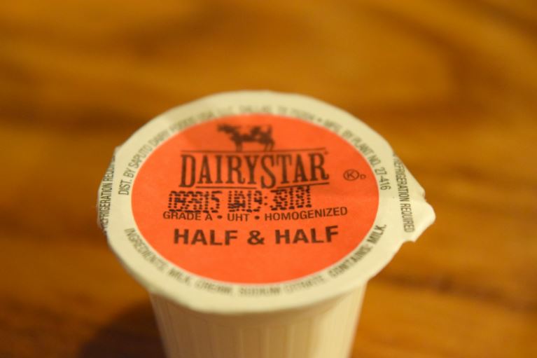 Quem desejar fazer um café com leite, na mesa ficam dispostos os famosos Half&Half, que são esses potinhos de leite.