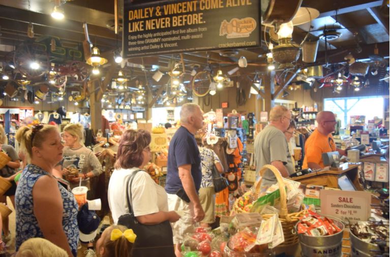 E a lojinha do Cracker Barrel em Orlando é um show à parte. Há muitas pessoas que optam por tomar café da manhã ali somente por causa da loja. Nela, você encontra de tudo: itens de decoração, roupas, brinquedos, acessórios (relógios, pulseiras, brincos, bolsas, óculos escuros), creme de corpo, sabonete, botas, cartões postais, dentre outros.