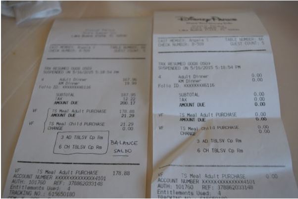 Caso você venha a utilizar o Disney Dining Plan, o Plano de Refeição da Disney, consumirá 01 crédito de Table Service por pessoa. As taxas já são incluídas no plano de refeição, porém, as gorjetas não. Então, você pode olhar na nota fiscal qual o valor deverá ser disponibilizado em dinheiro (15%, 18% ou 20%), assim como pode olhar os créditos remanescentes no seu plano.