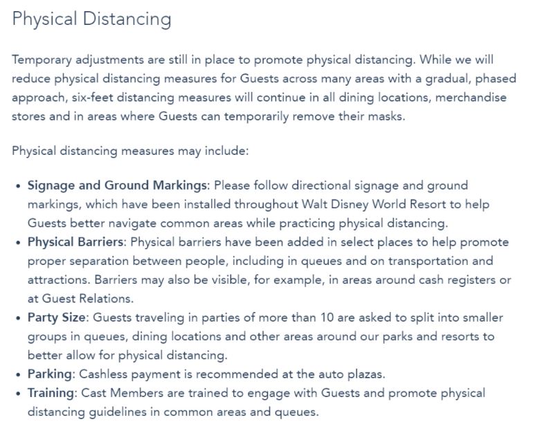 No site The Walt Disney World, uma pequena mudança já pode ser notada com relação às regras de distanciamento físico.