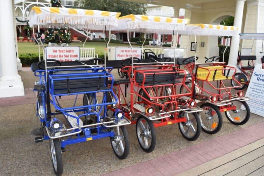 Um dos grandes atrativos do Disney’s Boardwalk é o passeio de bicicleta, que pode ser dupla ou quádrupla. O passeio é muito relaxante e em meio às andanças diárias nos parques, acaba sendo saudável, pois alivia a circulação do sangue nas pernas.