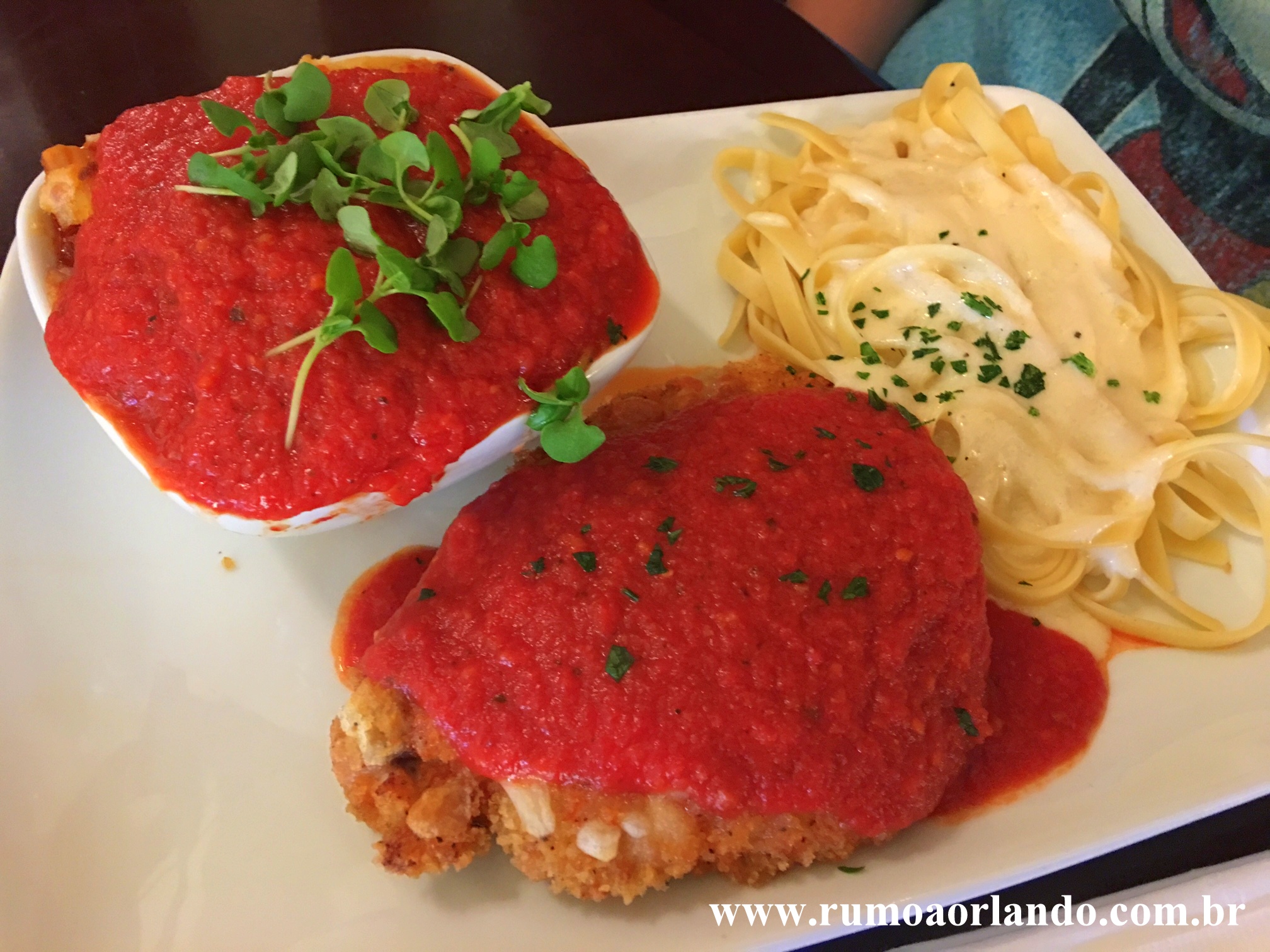 Descrição: três favoritos clássicos em um prato – Frango à parmegiana, rigatoni assado e fettuccine Alfredo.