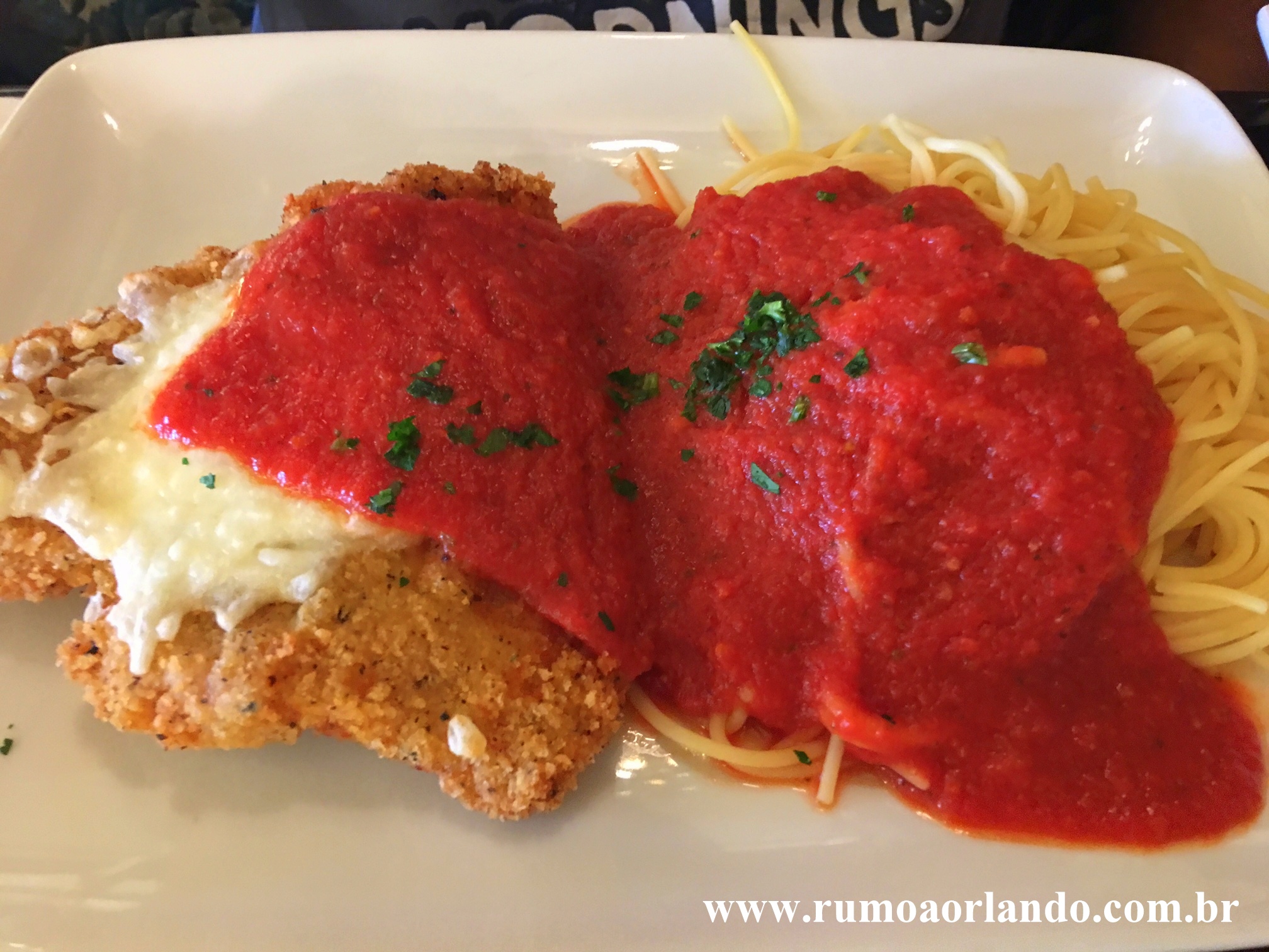 Descrição: Peito de frango levemente empanado com queijo muçarela derretido e o molho marinara Tony's sobre o espaguete.