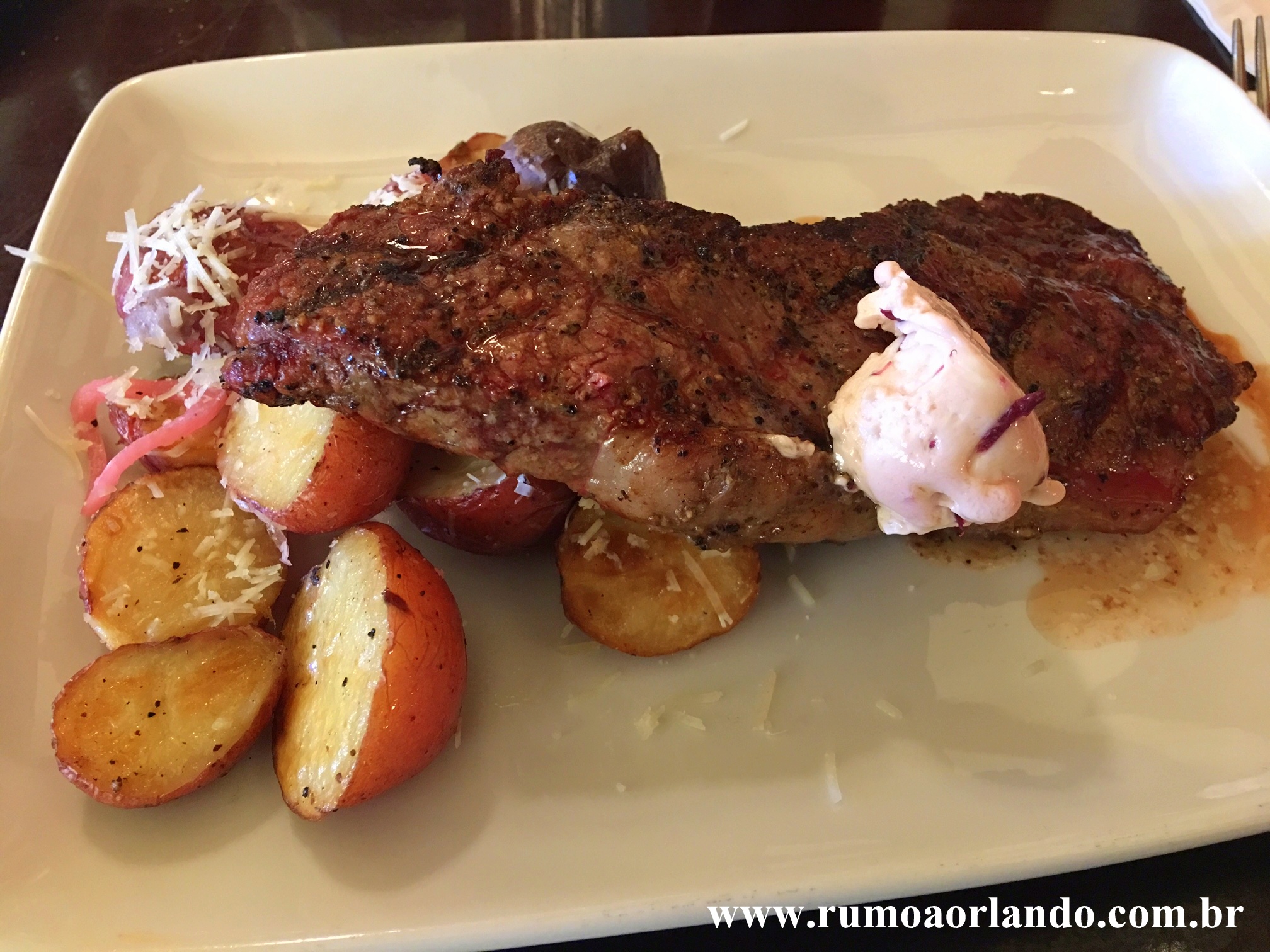 Descrição: Bife de contrafilé com rúcula, cebola, pimentão, batata e queijo romano, coberto com manteiga de Chianti.