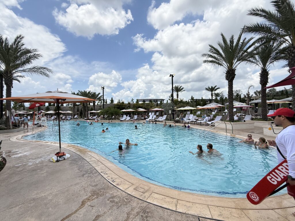 O hotel conta com uma piscina ampla estilo resort, ideal para relaxar após um dia de parque.
