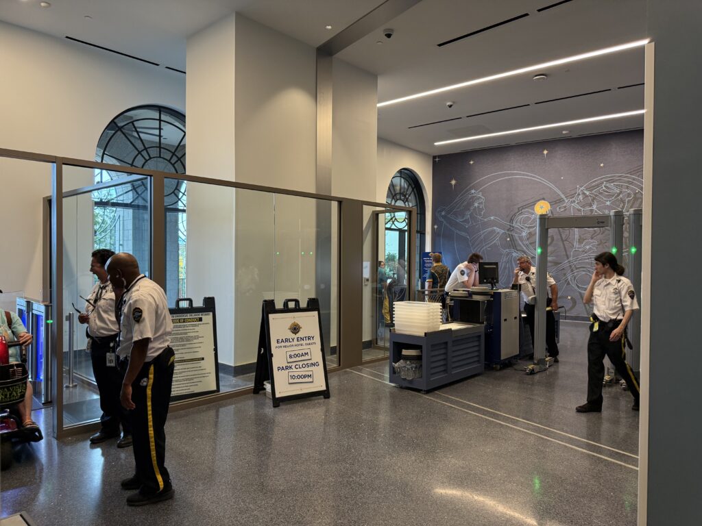 Dentro do próprio hotel tem uma passagem para o parque e tanto a checagem de ingressos quanto de segurança das bolsas são feitas dentro do hotel, fazendo com que você evite as filas da entrada do parque.
