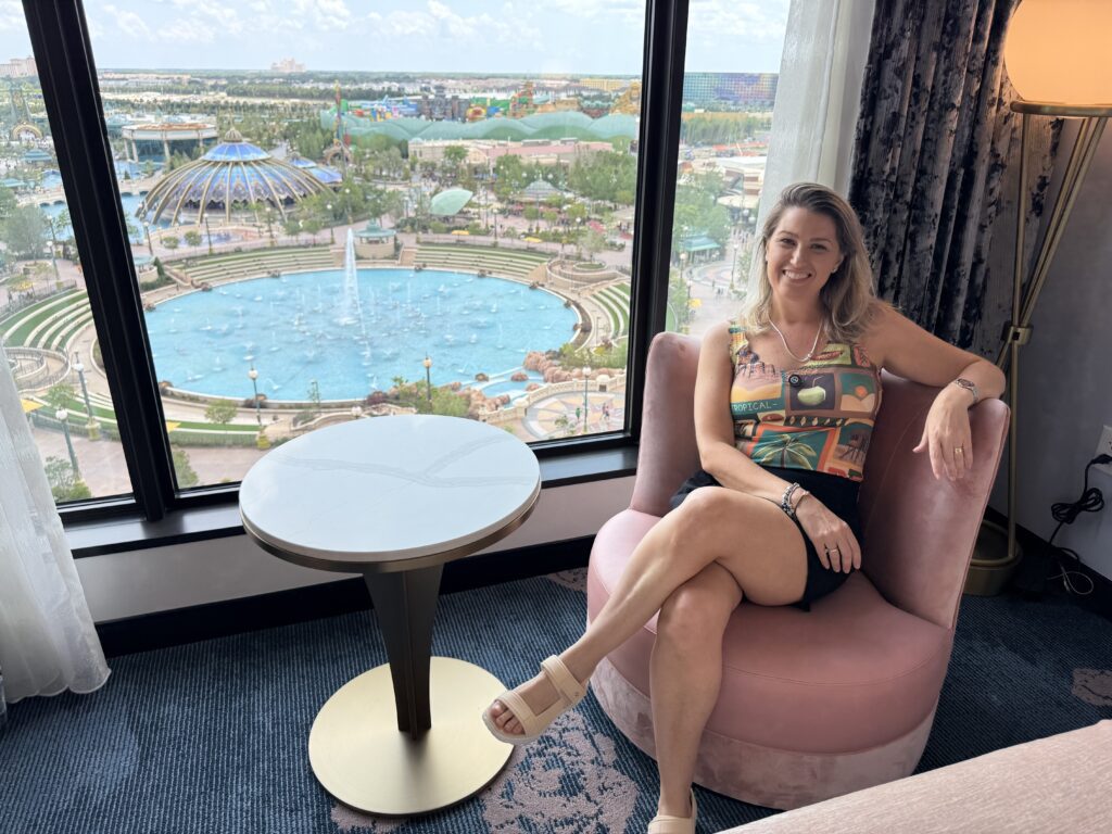 É possível escolher quartos com vista para a piscina, para o Epic Universe ou para a cidade de Orlando. Os preços variam conforme a escolha.