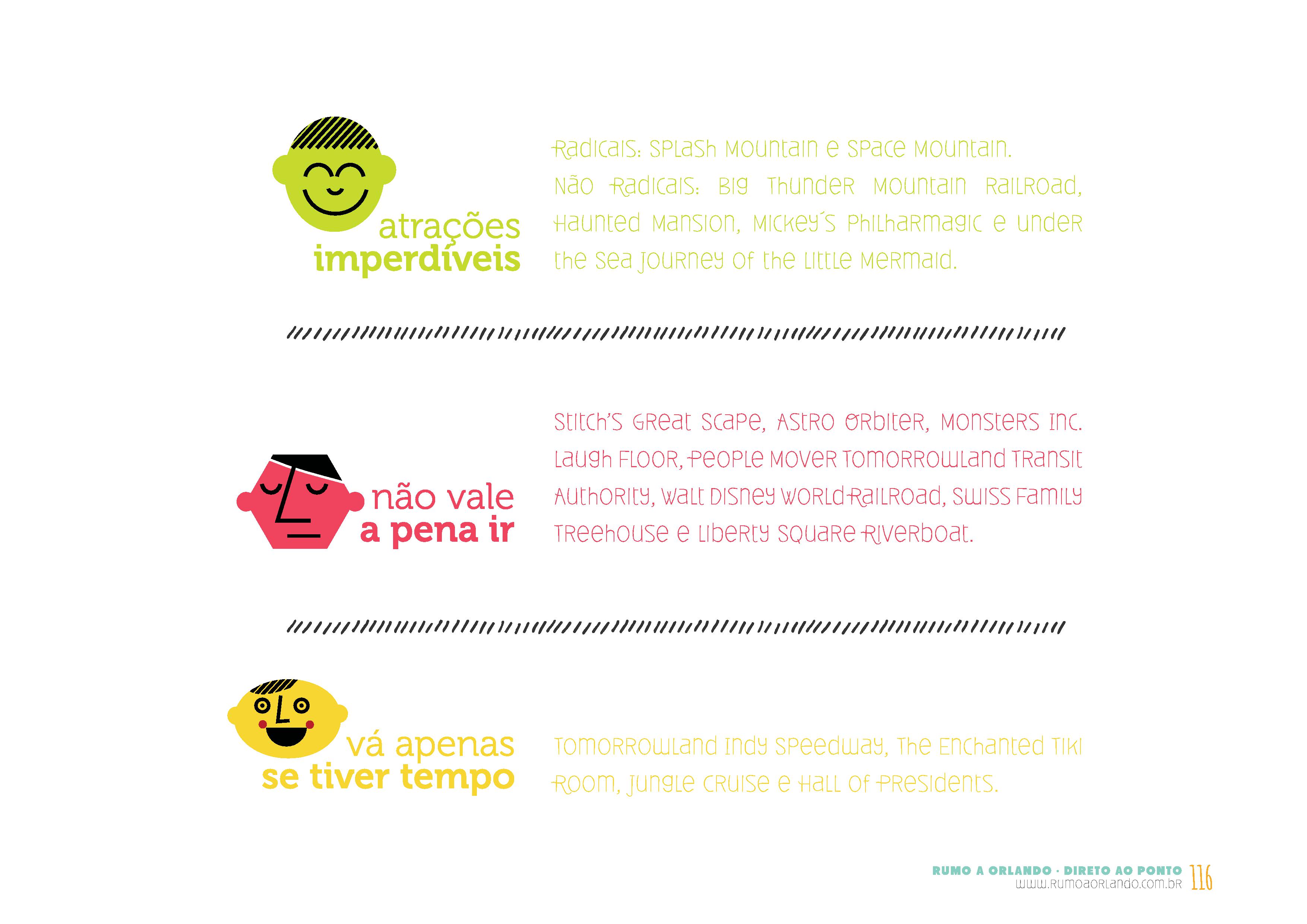 Nos dias de parques você terá o roteiro completo de atrações a seguir, incluindo as ordens, quais são recomendadas, quais são radicais, quais são lights, quais são imperdíveis, quais podem ser dispensadas e, claro, tudo sobre o sistema de filas expressas de todos os parques para você saber como pegar filas menores. Tudo organizado e ilustrado de uma maneira muito simples de seguir.
