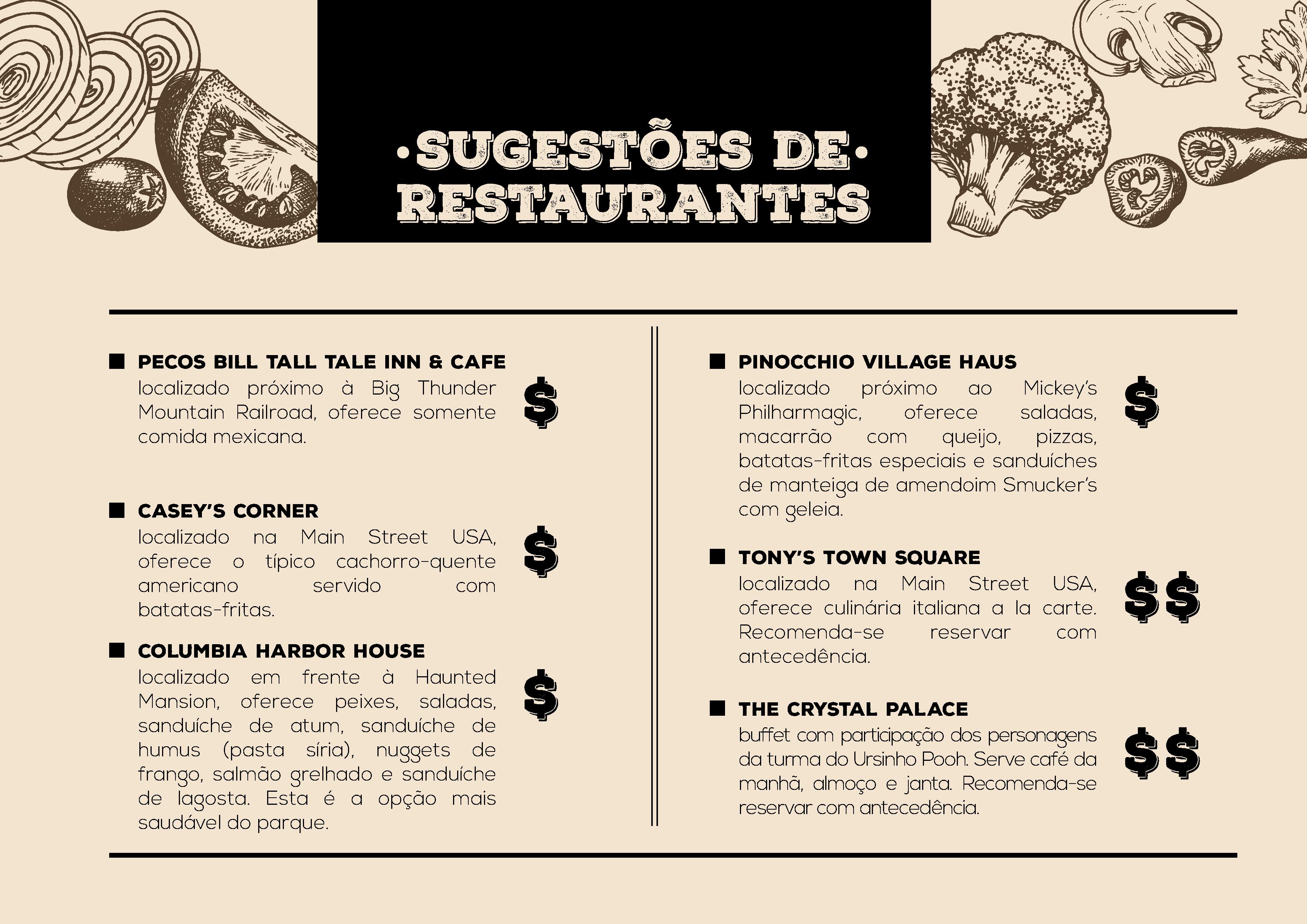 Além de tudo isso, nosso guia de Orlando traz também uma lista completíssima de indicações de restaurantes, suas categorias, médias de preços e cardápio. A finalidade é você fazer o planejamento e evitar perder o seu bem mais precioso: o seu tempo (e dinheiro também, pois não há mal nenhum em economizar).