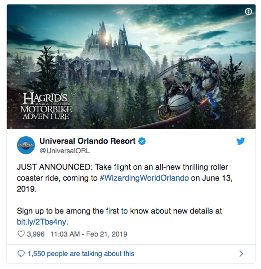 A montanha-russa se chamará “Hagrid’s Magical Creatures Motorbike Adventure” e será inaugurada em 13/06/19 na área The Wizarding World of Harry Potter – Hogsmeade, onde antigamente funcionava a montanha-russa Dragon Challenge.
