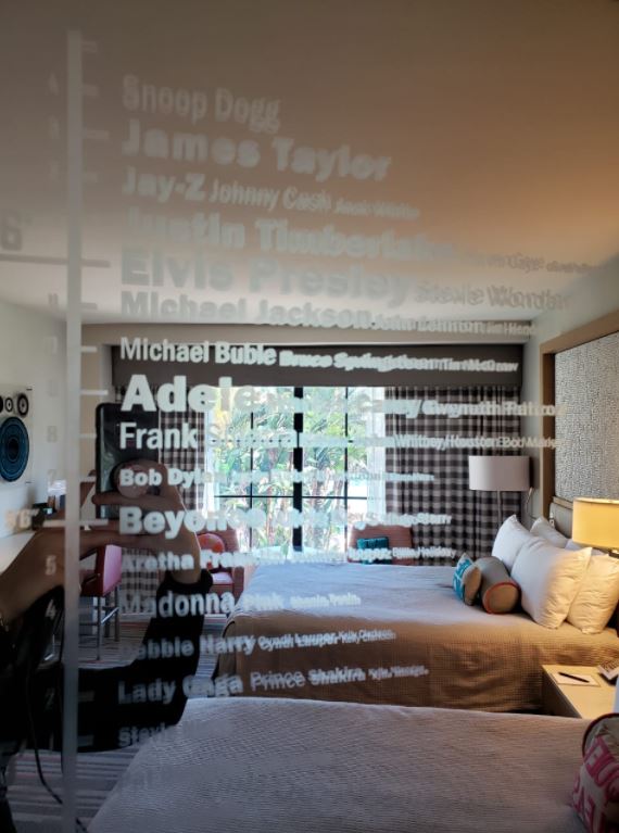 O hotel é todo inspirado no tema rock and roll, então, há muita influência de músicos e artigos musicais.
