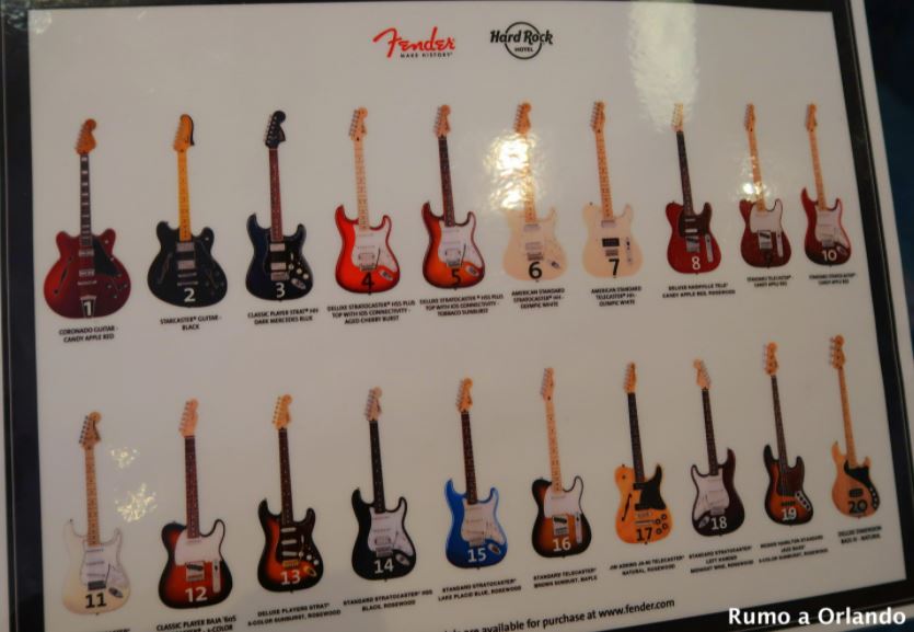 As opções de guitarras disponíveis são estas da foto abaixo e este é um benefício dado a todos os hóspedes do hotel.