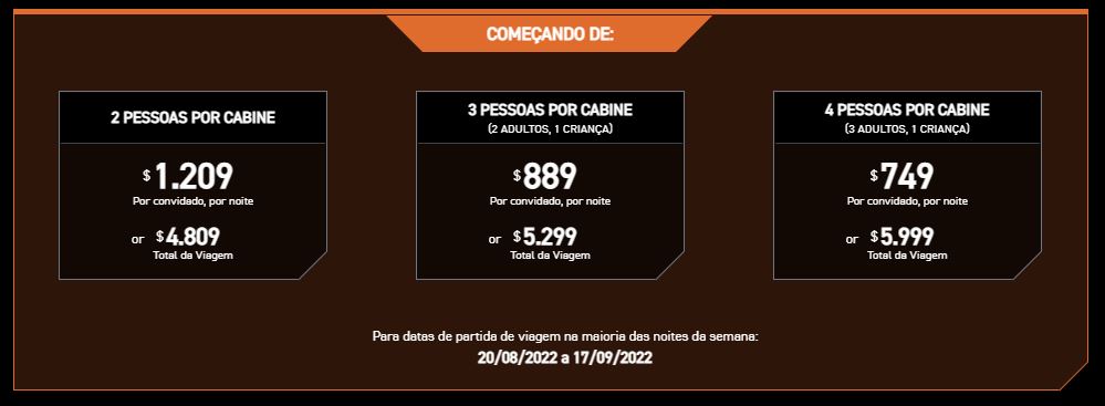 O valor da experiência vai ser a partir de U$4.809 para 2 adultos, U$ 5.299 para uma família de 03 pessoas e $5.999 para uma família de 04 pessoas.