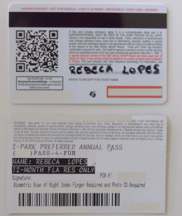 Dica: escreva o nome de cada usuário dos ingressos atrás dos mesmos para que consiga identificar ao longo da viagem o dono de cada um. Isso será importante, já que na visita ao primeiro parque Disney você precisará cadastrar a impressão digital na catraca e precisará utilizar novamente o mesmo ticket/dedo cadastrados nos parques restantes.