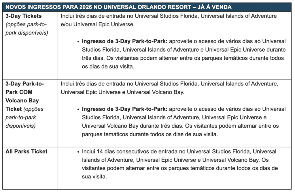 Os visitantes já podem garantir ingressos de 3 ou 14 dias para visitas a partir de 2026, com acesso aos parques Universal Studios, Islands of Adventure e Epic Universe, com opções de upgrade que incluem acesso ao parque aquático temático, Volcano Bay, além de permitir acesso park-to park (acesso de um parque ao outro) no mesmo dia.