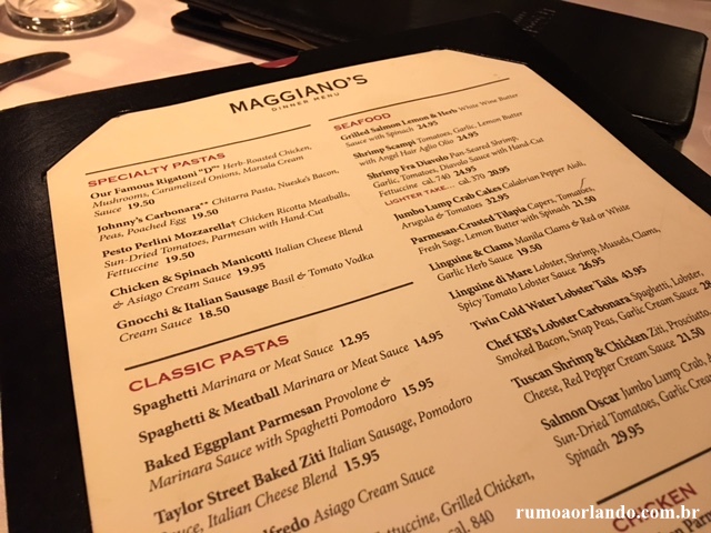 A especialidade do Maggiano's são as comidas italianas, mas há também frutos do mar e carnes. O menu completo pode ser conferido aqui e, abaixo, você confere nossos pedidos para servir como base para quando a sua visita for feita.