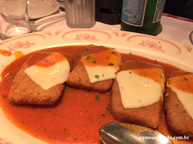 Pedaços de muçarela frita, servidos com molho de tomate.