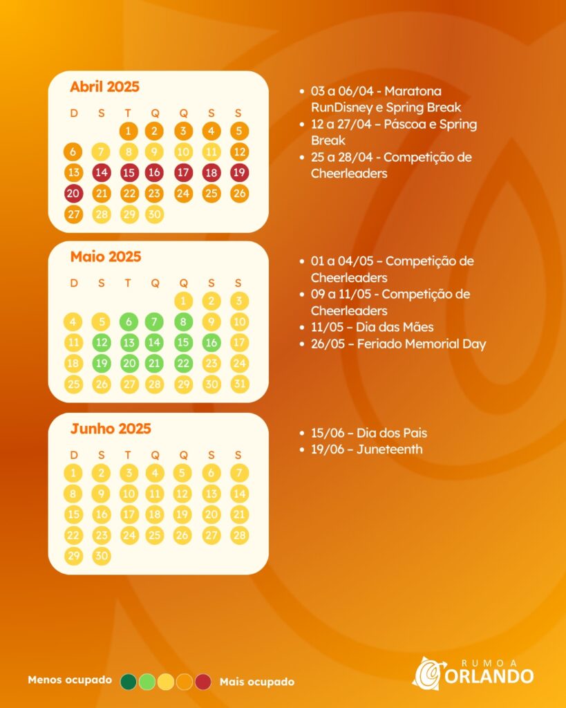 03 a 06/04 - Maratona RunDisney e Spring Break 12 a 27/04 – Páscoa e Spring Break 25 a 28/04 - Competição de CheerleadersMaio 2025
