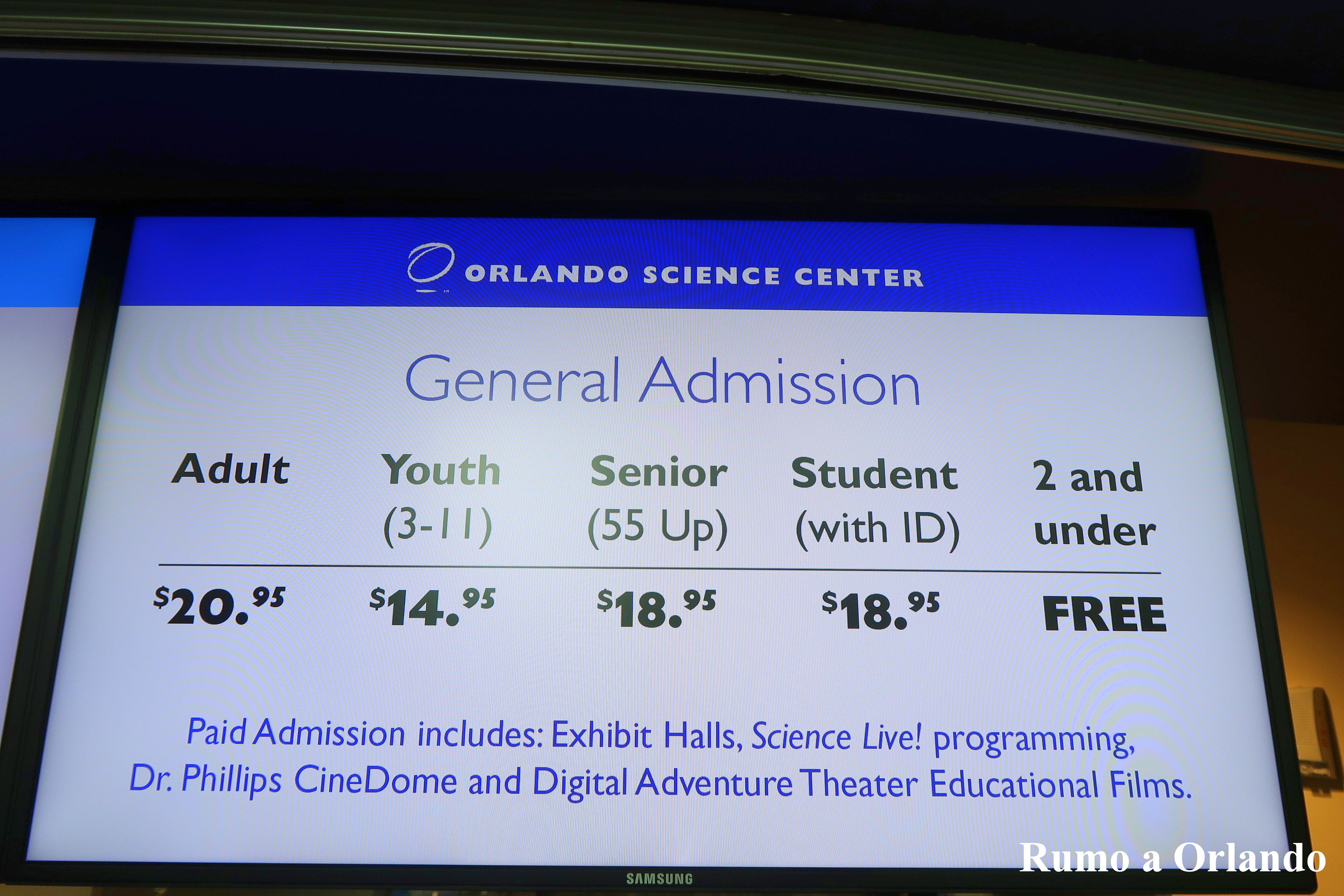 O estacionamento do local é pago e custa U$ 5,00 aproximadamente. Já a entrada no Orlando Science Center depende da idade da pessoa: Adulto (acima de 12 anos): US$21,00 Criança (entre 3 e 11 anos): US$15,00 Idoso (acima de 55 anos): US$19,00 Bebê (2 anos ou menos): Não paga (valores atualizados em Julho/2020)