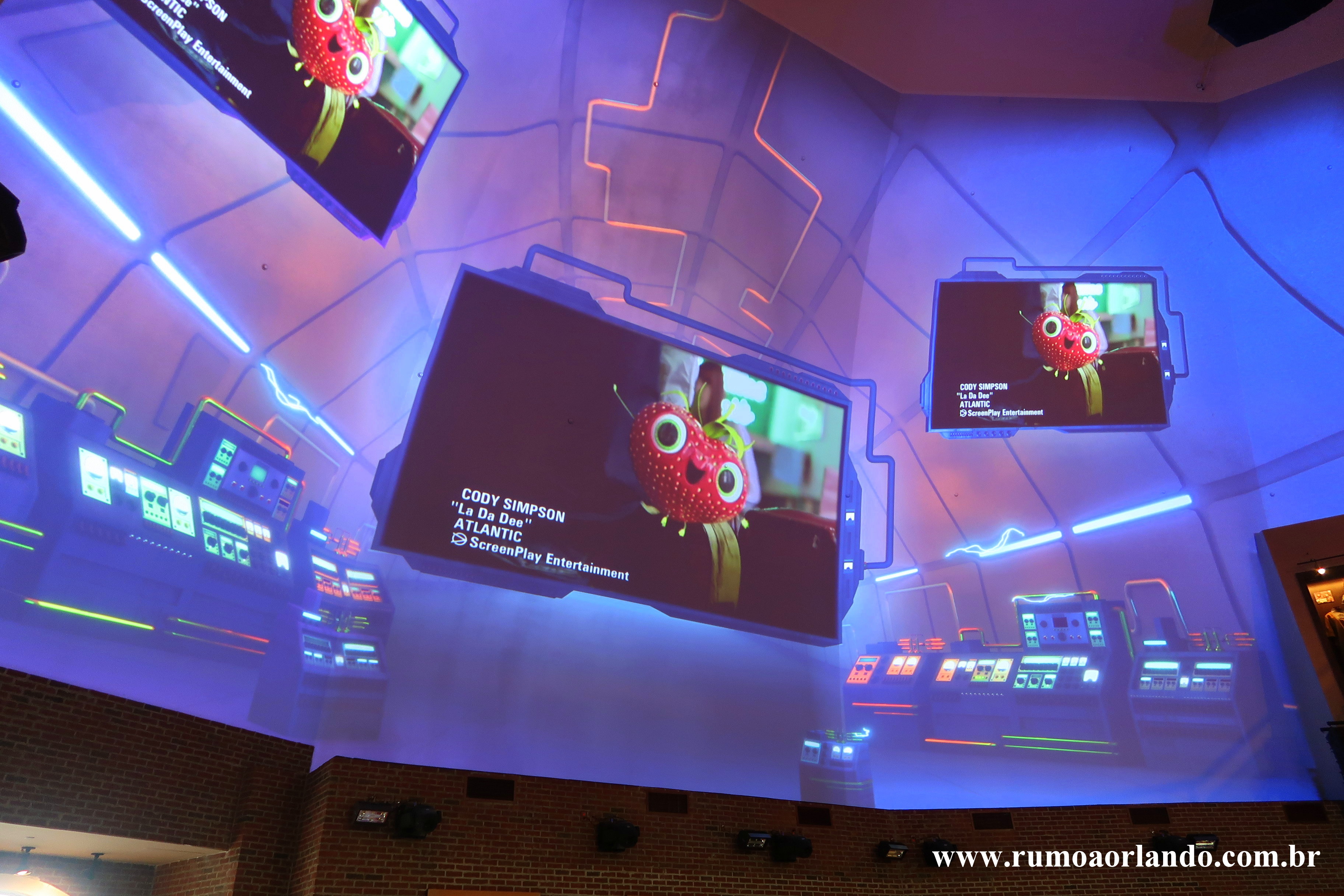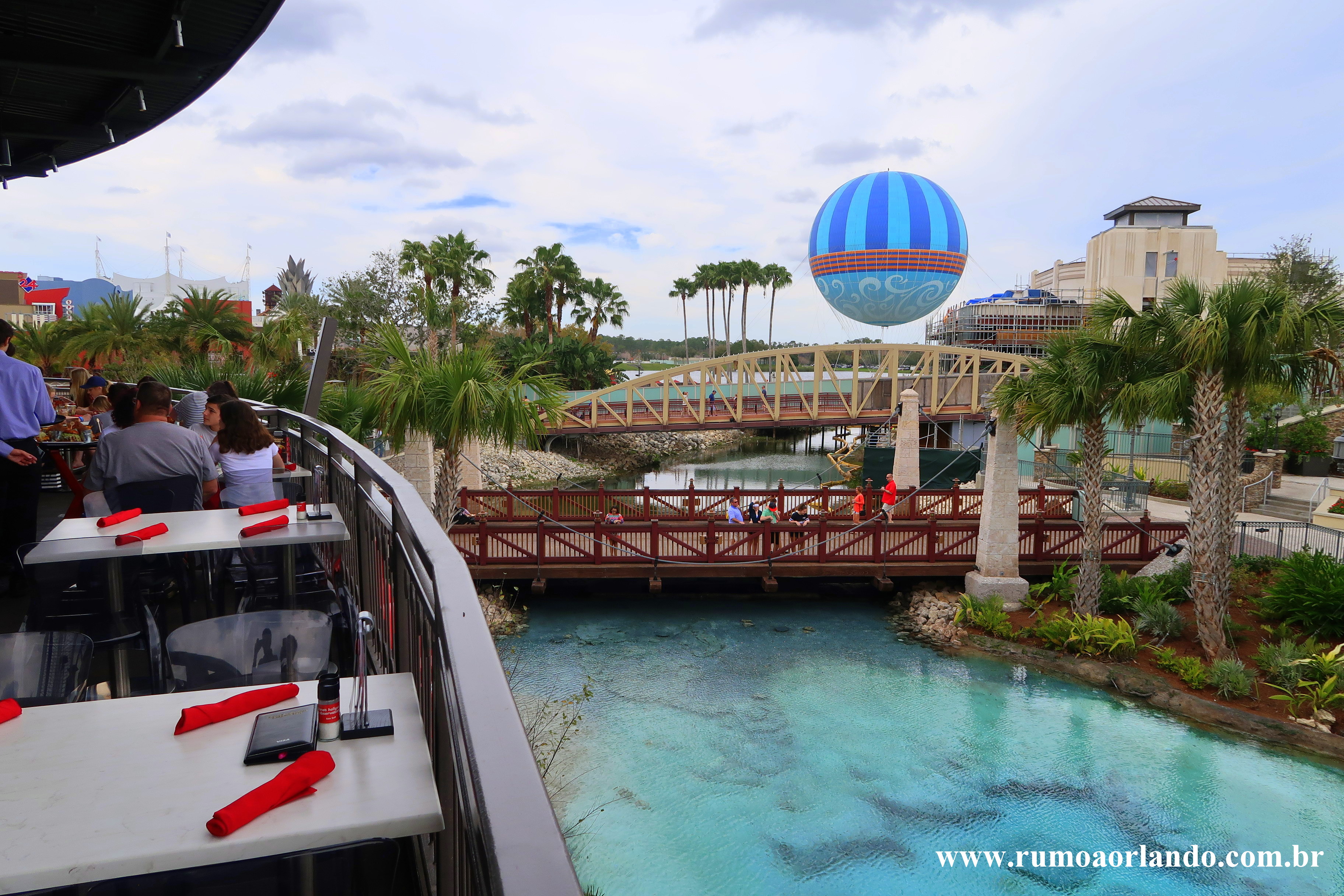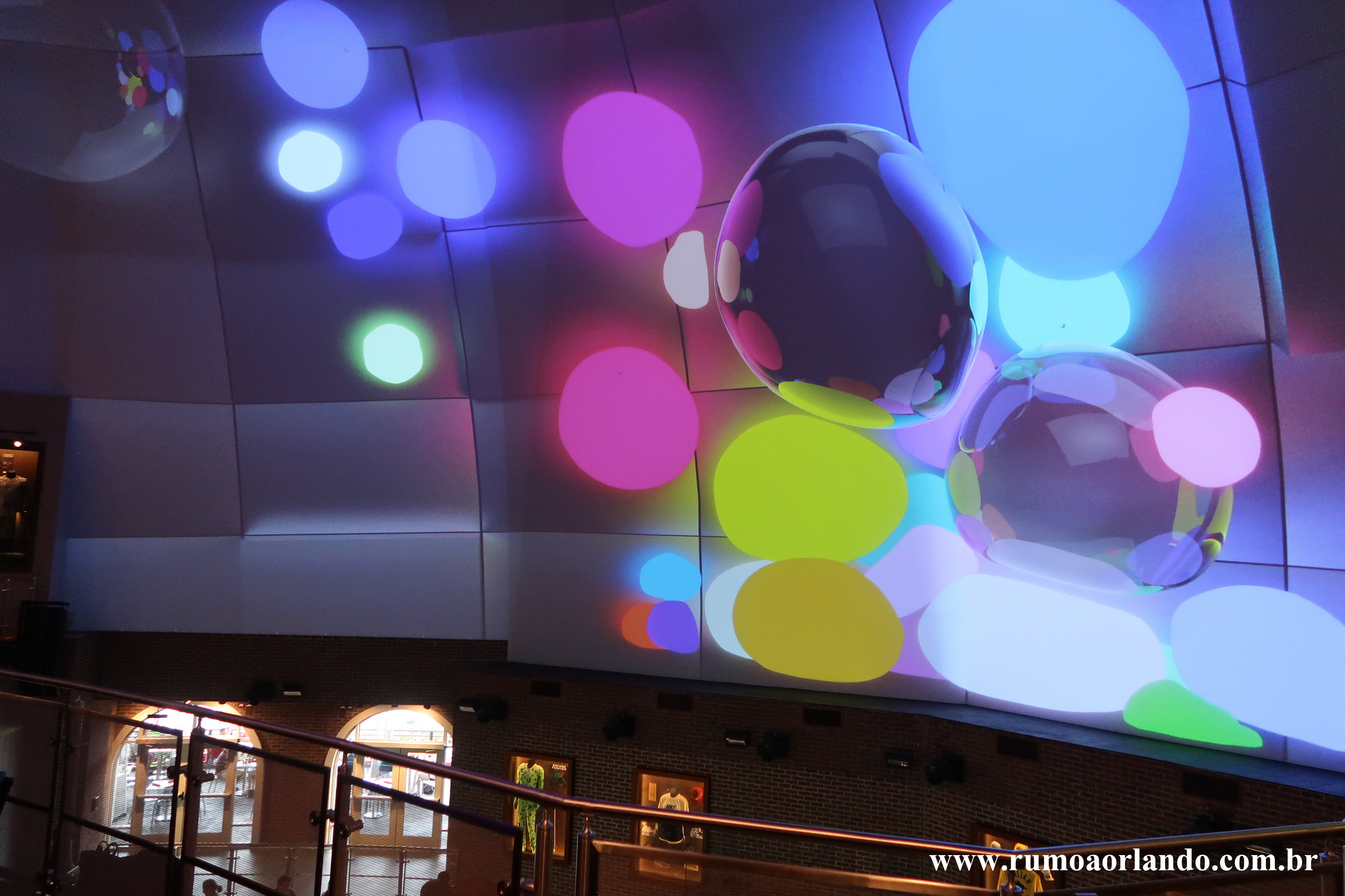 São três andares internos e há ainda uma varanda com uma vista incrível para o balão de Disney Springs. O terceiro andar é geralmente usado para grupos de excursão ou eventos privativos.