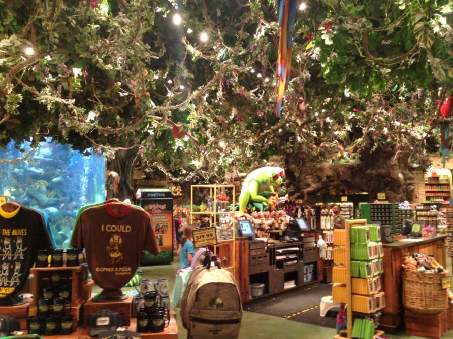 Após a chegada, é necessário fazer o check-in na recepção, quando você receberá um pager, que ao vibrar significará que sua mesa está pronta. Neste meio tempo, aproveite para visitar a loja do Rainforest Cafe. Você vai encontrar blusas, bonés, chaveiros, mochilas, pelúcias, artigos para cozinha, capas para celular e mais um monte de coisas!