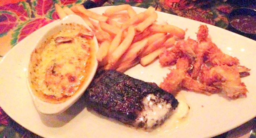 - Jungle Steak and Shrimp: mix de camarões empanados com coco, steak de carne e camarões grelhados ao molho de manteiga, servidos com batatas-fritas. Valor: U$34.99