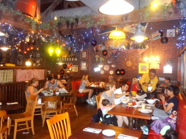As paredes são repletas de quadros (muitos deles, tortos), fotos e artigos típicos. É bem bonita a decoração com luzes que eles fazem para parecer que está de noite. É muito aconchegante.