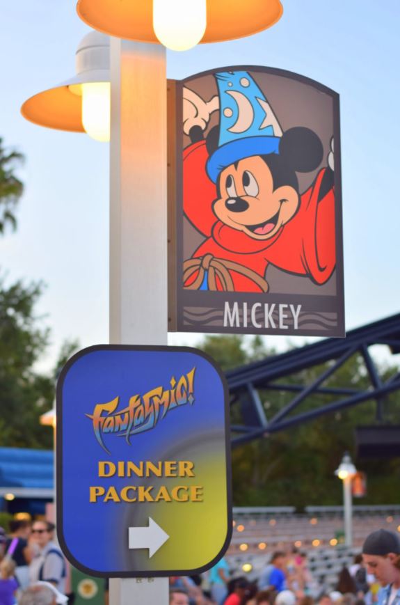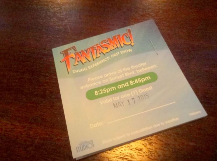 Nossa reserva foi feita com o assento VIP para assistir ao Fantasmic, o show noturno deste parque. Junto com a conta, o garçom fornece 01 ticket por pessoa e nele vem o horário em que você deve se apresentar na arena onde acontece o espetáculo.