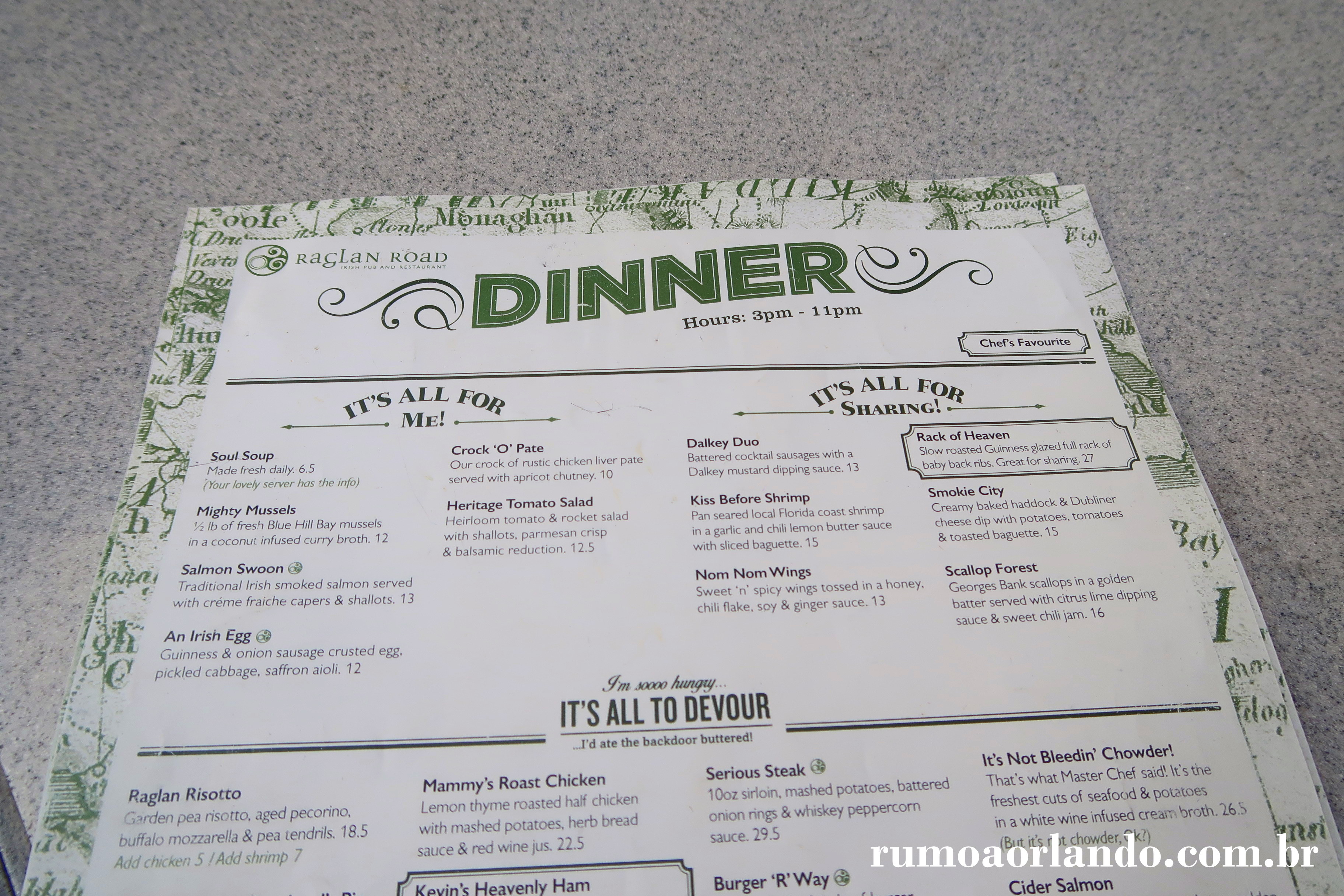O Raglan Road Irish Pub aceita o Plano de Refeições da Disney e requer 01 crédito de Table Service por pessoa.
