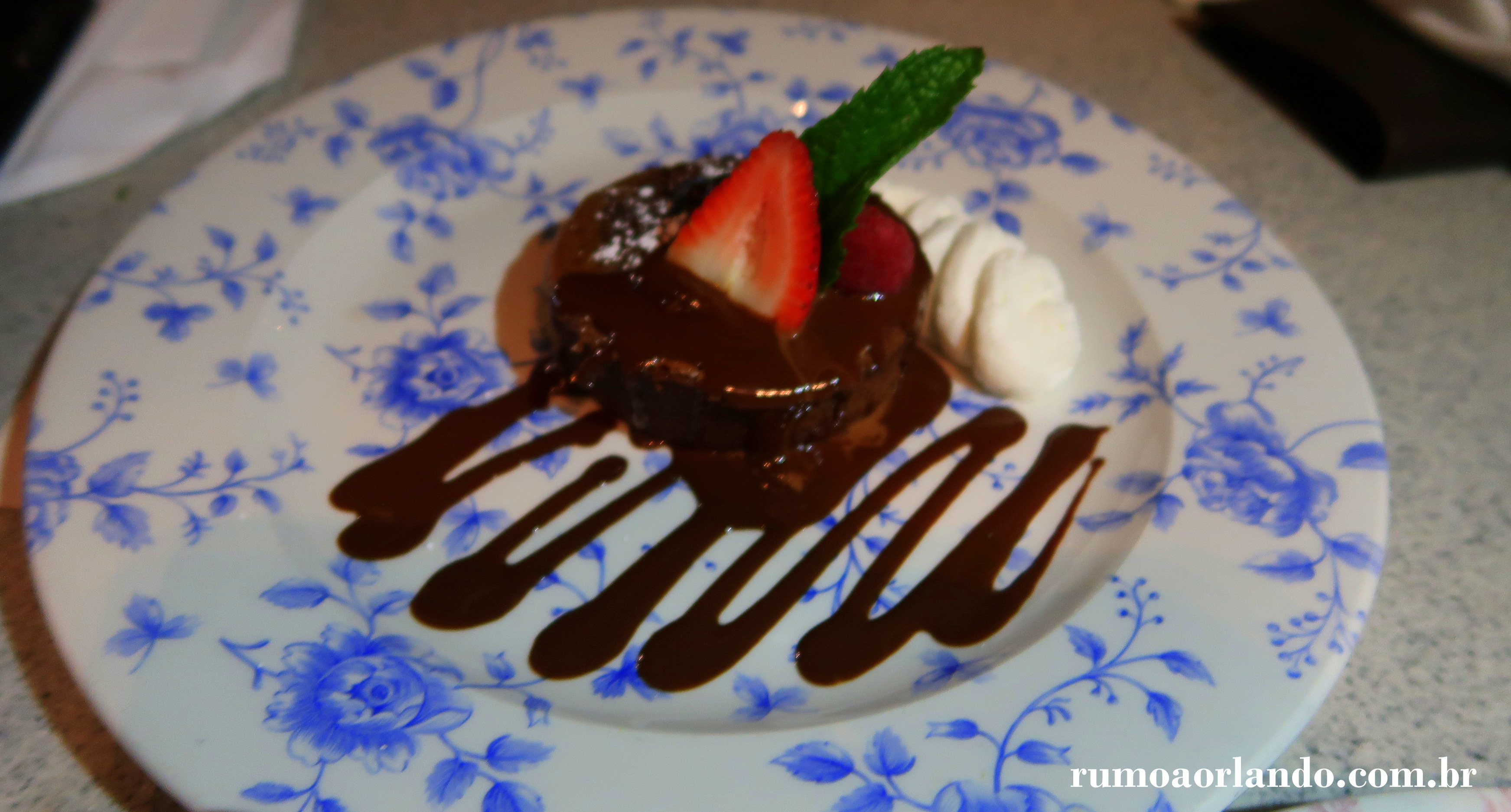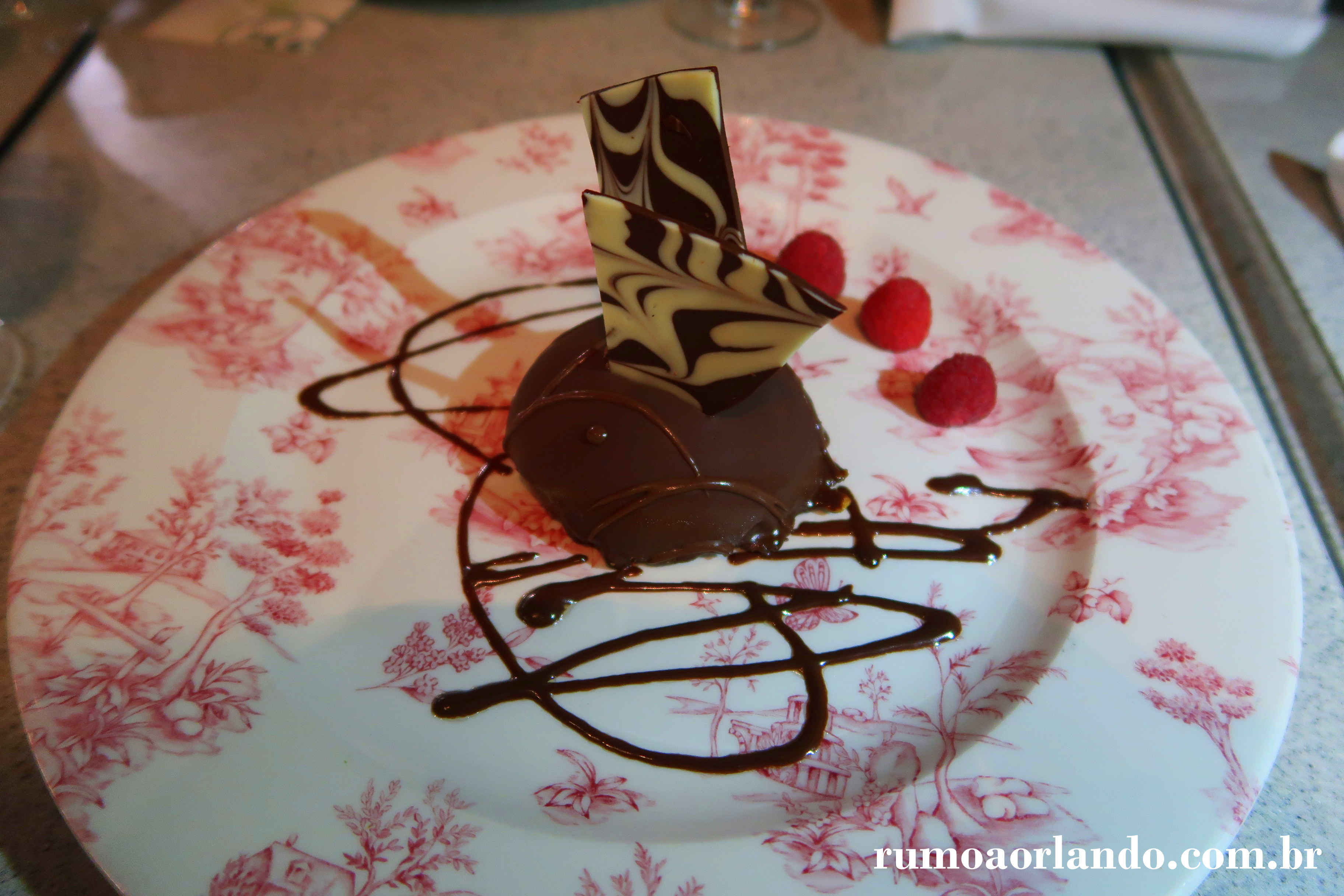 Bolo de chocolate sem farinha, frutas silvestres frescas, ganache de chocolate com chantili (sem glúten e sem lactose).