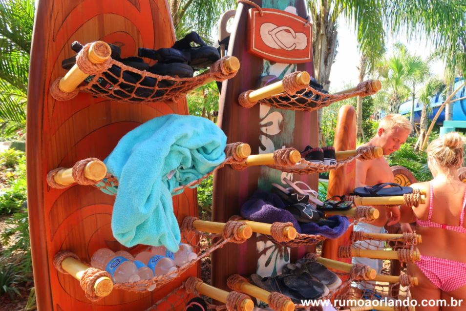 Existem duas opções para solucionar isso: andar o tempo todo de chinelos e ao entrar nas atrações deixá-lo nas cestinhas disponíveis em cada uma ou, quando permitido, entrar de chinelo nas atrações e, na hora de descer nos toboáguas, prendê-los entre os dedos.