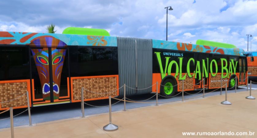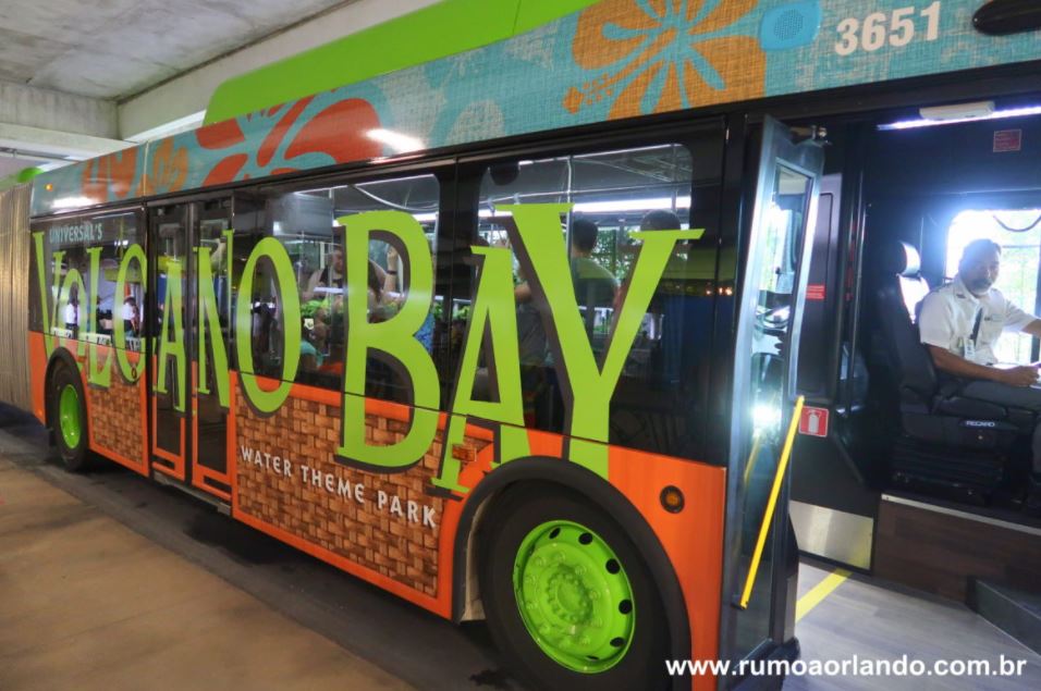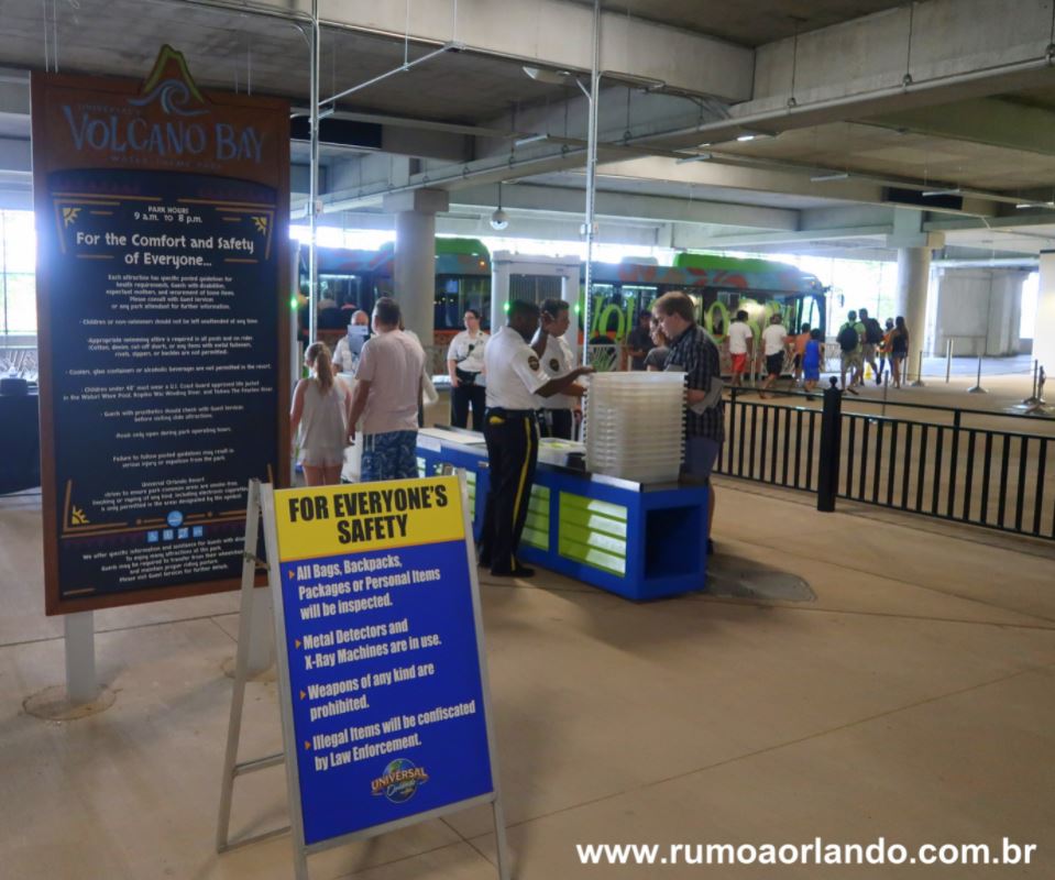 Após estacionar, você logo verá a área de segurança e embarque no ônibus que leva para a entrada do parque. Sim, diferente de como acontece para chegar à entrada dos parques Universal Studios e Islands of Adventure (para onde se vai a pé pelo Universal's City Walk), para chegar até o Volcano é preciso pegar um ônibus.